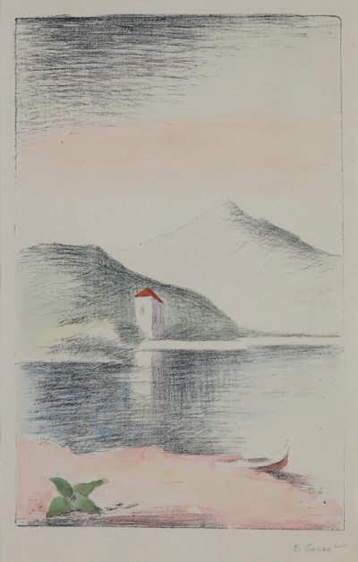 Litografia su carta acquerellata a mano dall’artista. Stampata da Fornasetti nel 1944 per le Edizioni La Colomba. cm 39x25, cm 54x40