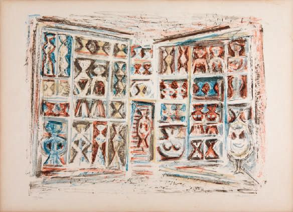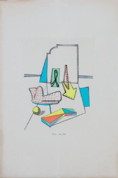 Litografia su carta acquerellata a mano dall’artista. Stampata da Fornasetti nel 1944 per le Edizioni della Colomba. cm 40x25, cm 56x42