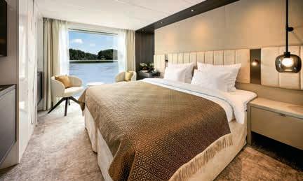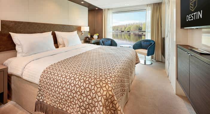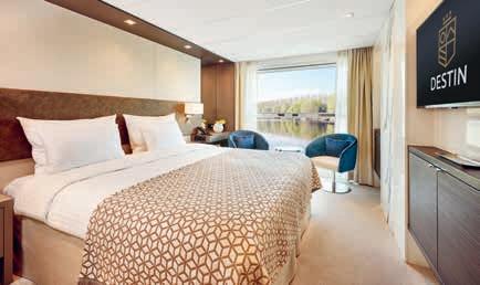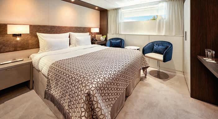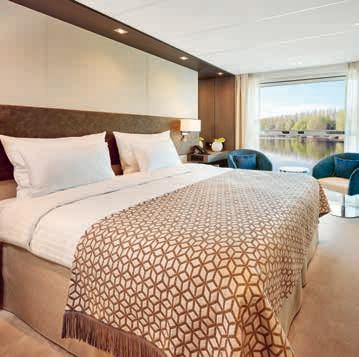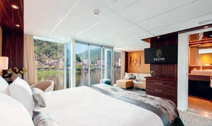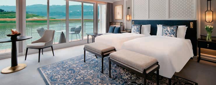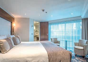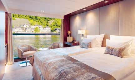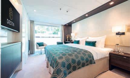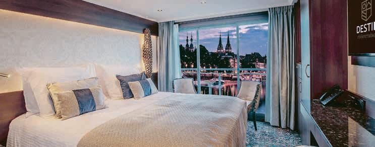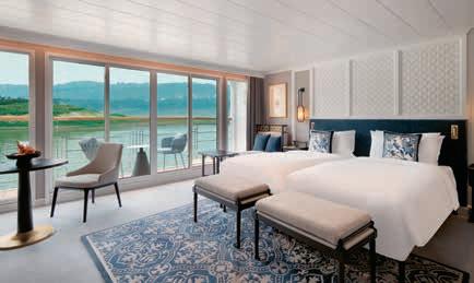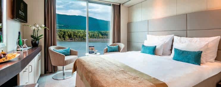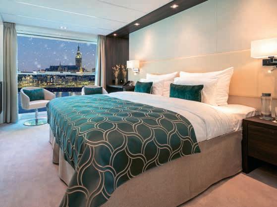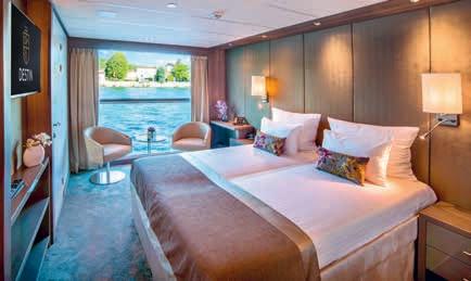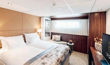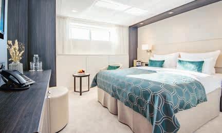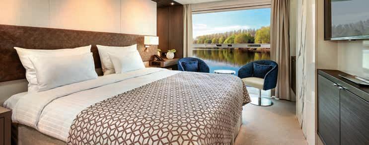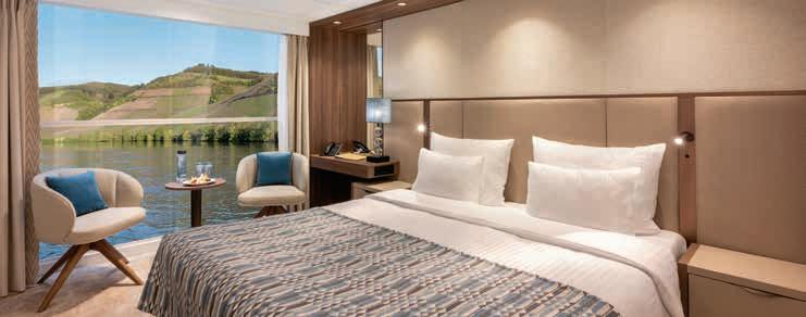 Aan boord van uw hotelschip verblijft u in stijlvolle Deluxe suites (31 m²), een rustgevende plek waar comfort, elegantie en verwennerij samenkomen. Elk van de 74 ruime suites beschikt over een ruim privébalkon met panoramisch uitzicht op de rivier. U geniet van persoonlijke service, verfijnde extra’s en exclusieve toegang tot lounges en restaurants.
