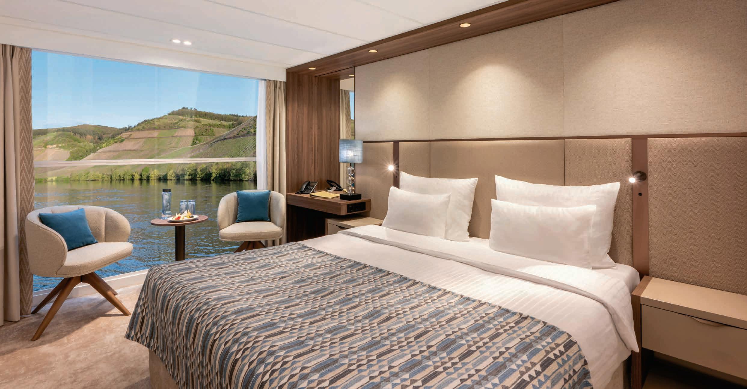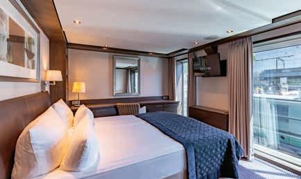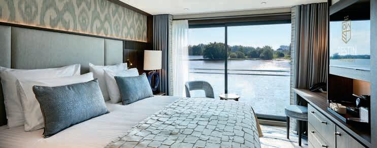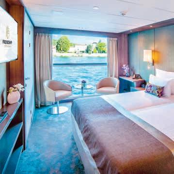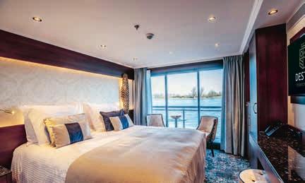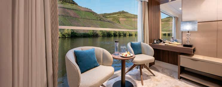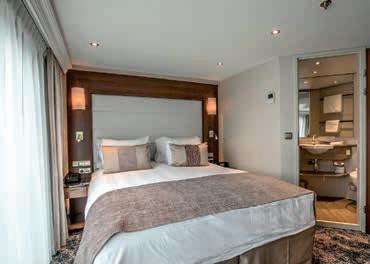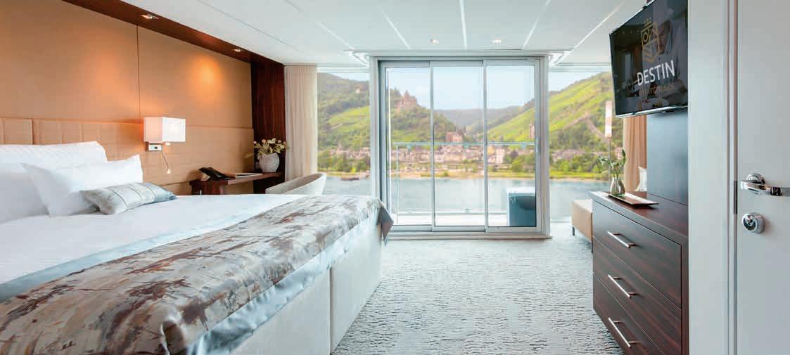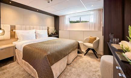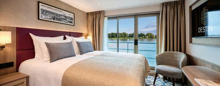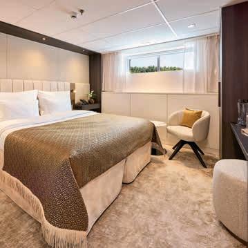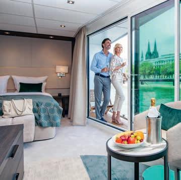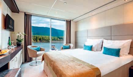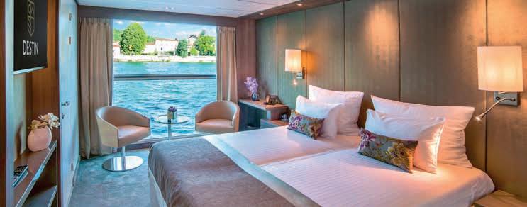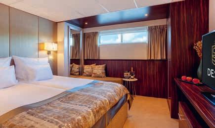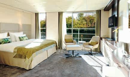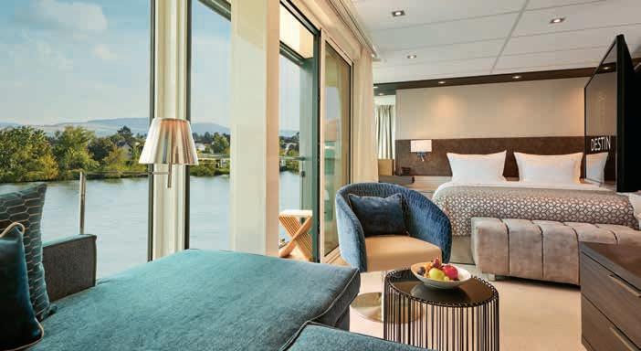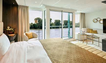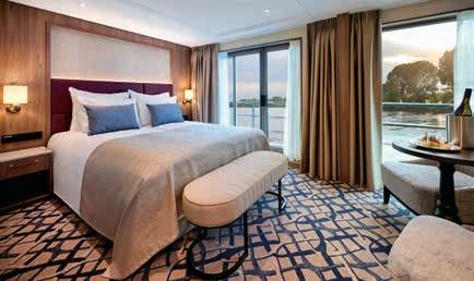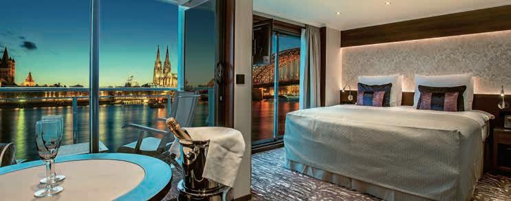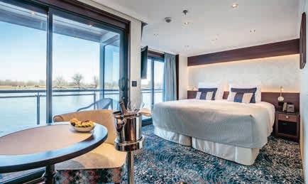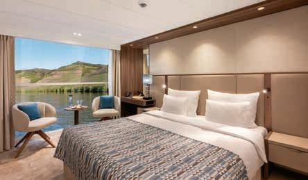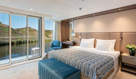 Aan boord van uw hotelschip verblijft u in stijlvolle Deluxe suites (31 m²), een rustgevende plek waar comfort, elegantie en verwennerij samenkomen. Elk van de 74 ruime suites beschikt over een ruim privébalkon met panoramisch uitzicht op de rivier. U geniet van persoonlijke service, verfijnde extra’s en exclusieve toegang tot lounges en restaurants.
