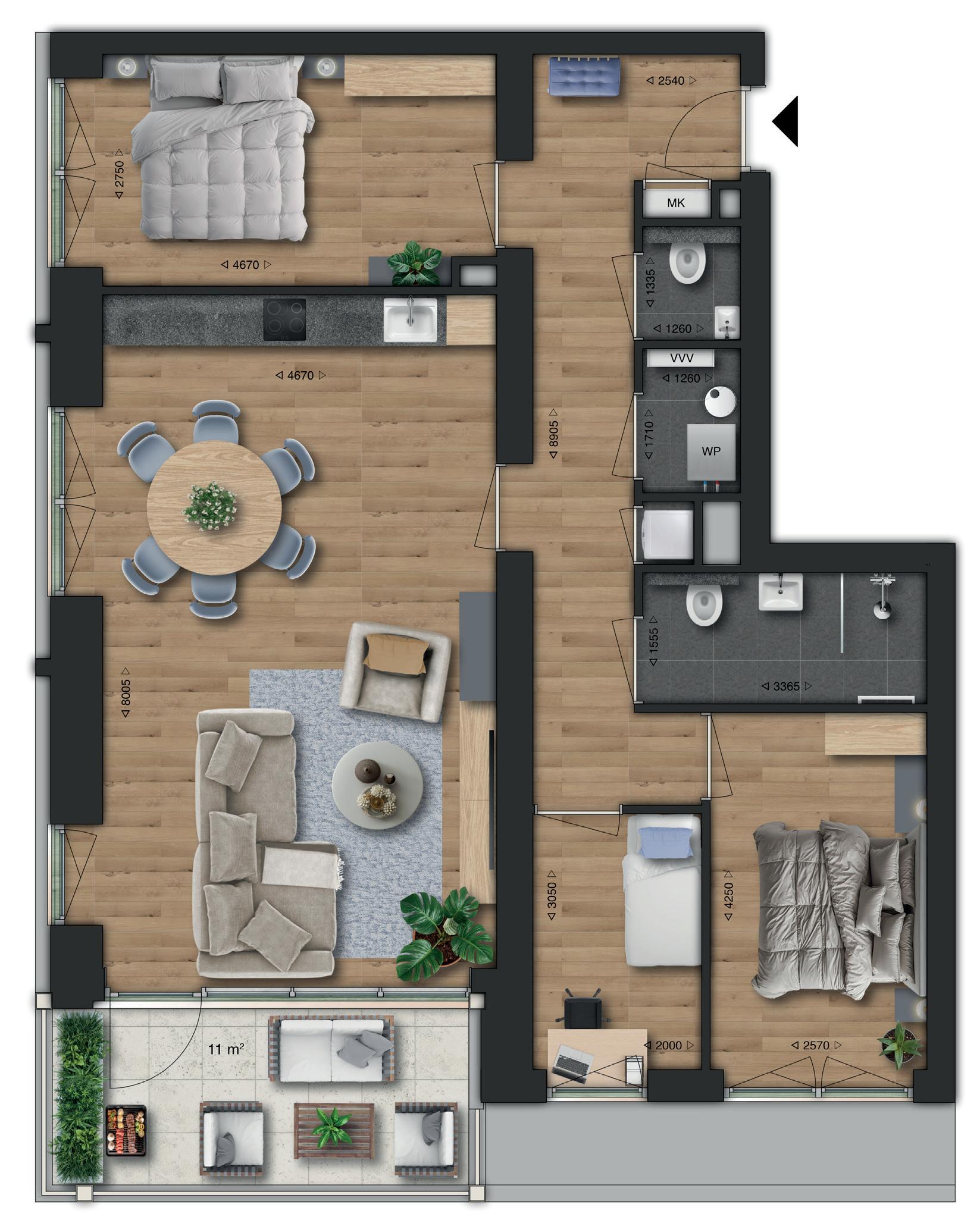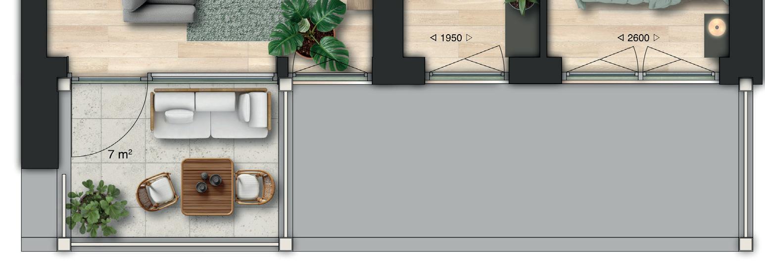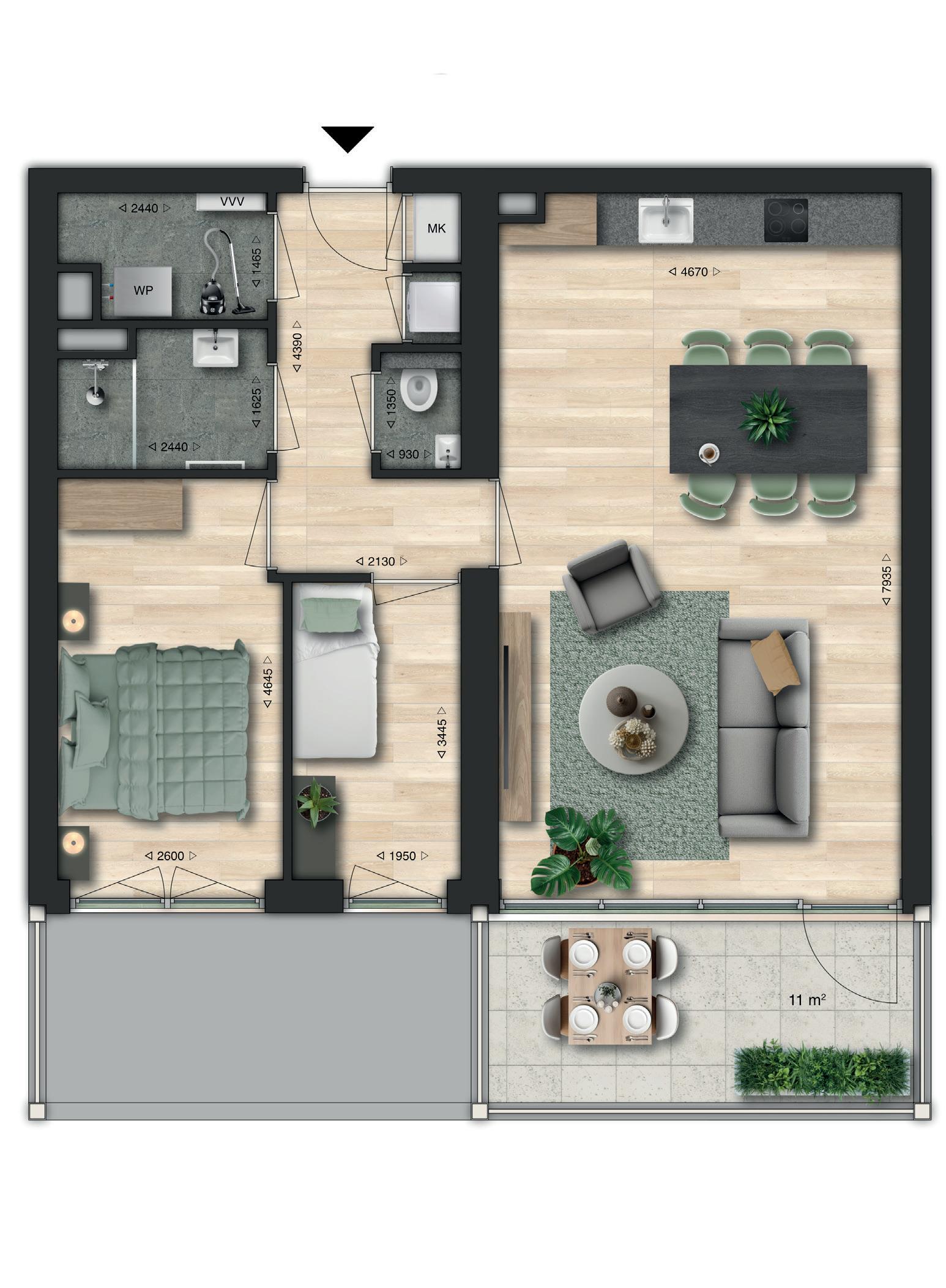 Type D is het driekamerappartement voor liefhebbers van ruimte en rust. Je woont hier gelijkvloers, comfortabel en royaal, met een fijne indeling en twee slaapkamers die je gebruikt zoals jij wilt. De leefruimte met open keuken voelt open en licht. Een heerlijke plek om thuis te komen en te ontspannen.