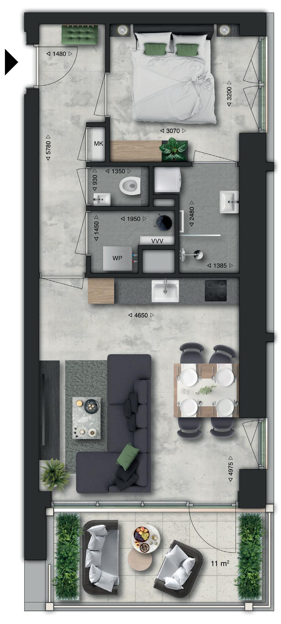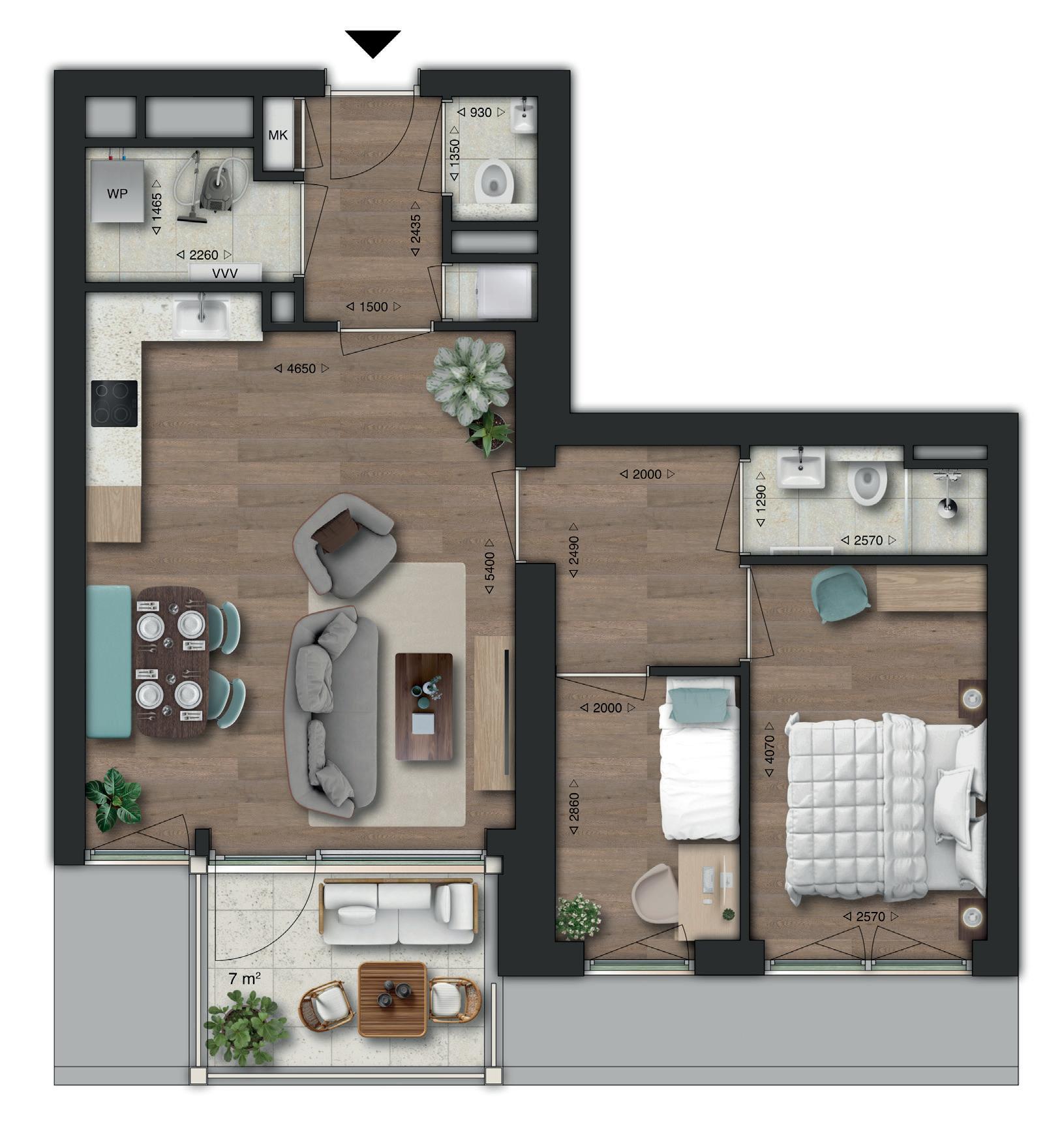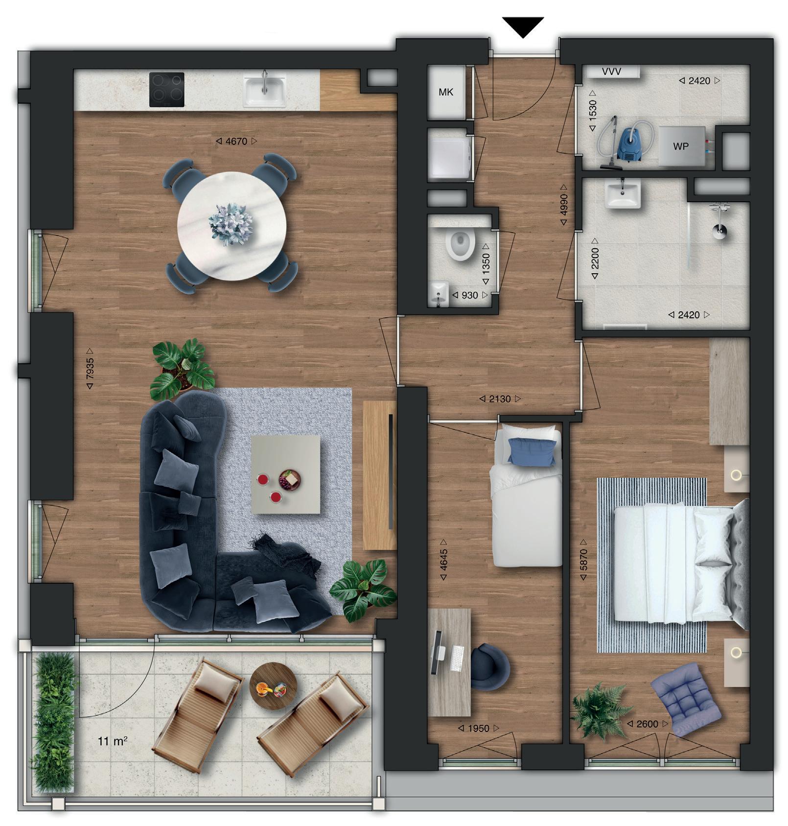 Type D is het driekamerappartement voor liefhebbers van ruimte en rust. Je woont hier gelijkvloers, comfortabel en royaal, met een fijne indeling en twee slaapkamers die je gebruikt zoals jij wilt. De leefruimte met open keuken voelt open en licht. Een heerlijke plek om thuis te komen en te ontspannen.