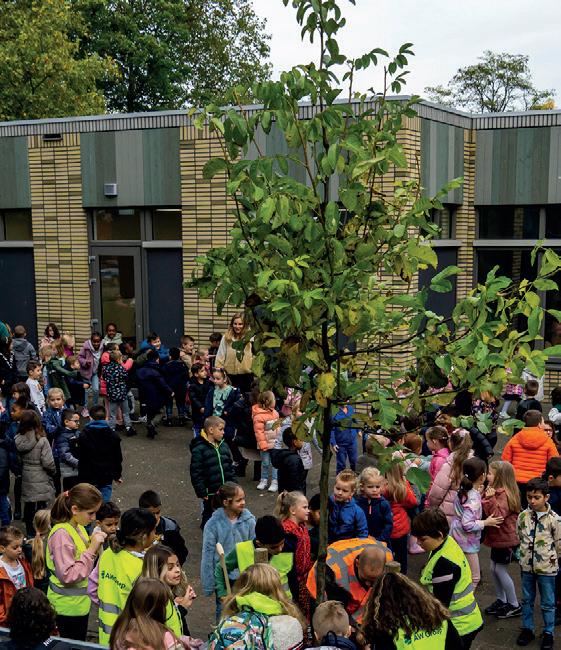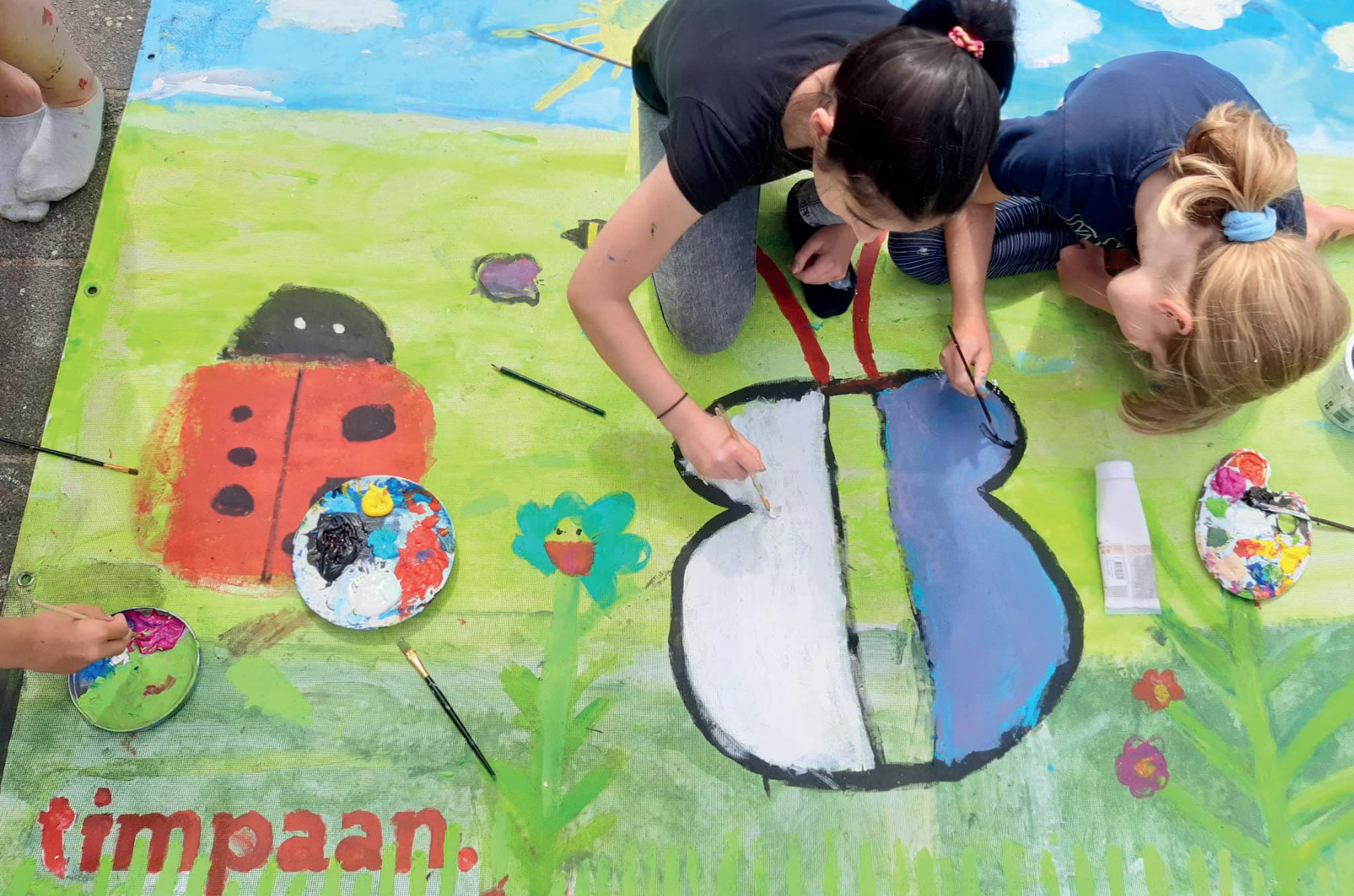 In mei 2022 organiseerde Timpaan een spetterende schilderworkshop voor groep 7 en 8 van basisschool De Schakel. Twee dagen lang beschilderden de leerlingen de grote bouwhekdoeken die rond de bouwlocatie van De Heemtuinen geplaatst waren. Om de school een blijvende herinnering aan de workshop te geven, doneerde AW Infrabouw - die verantwoordelijk is voor de groenaanplant in De Heemtuinen - een walnotenboom voor op het nieuwe schoolplein. Die werd feestelijk geplant door de kinderen uit groep 7 en 8, onder grote belangstelling van alle andere leerlingen. Ook verzorgde de tuinman van AW Infrabouw een inspirerende gastles over de natuur. De walnotenboom draagt bij aan de vergroening van het plein.