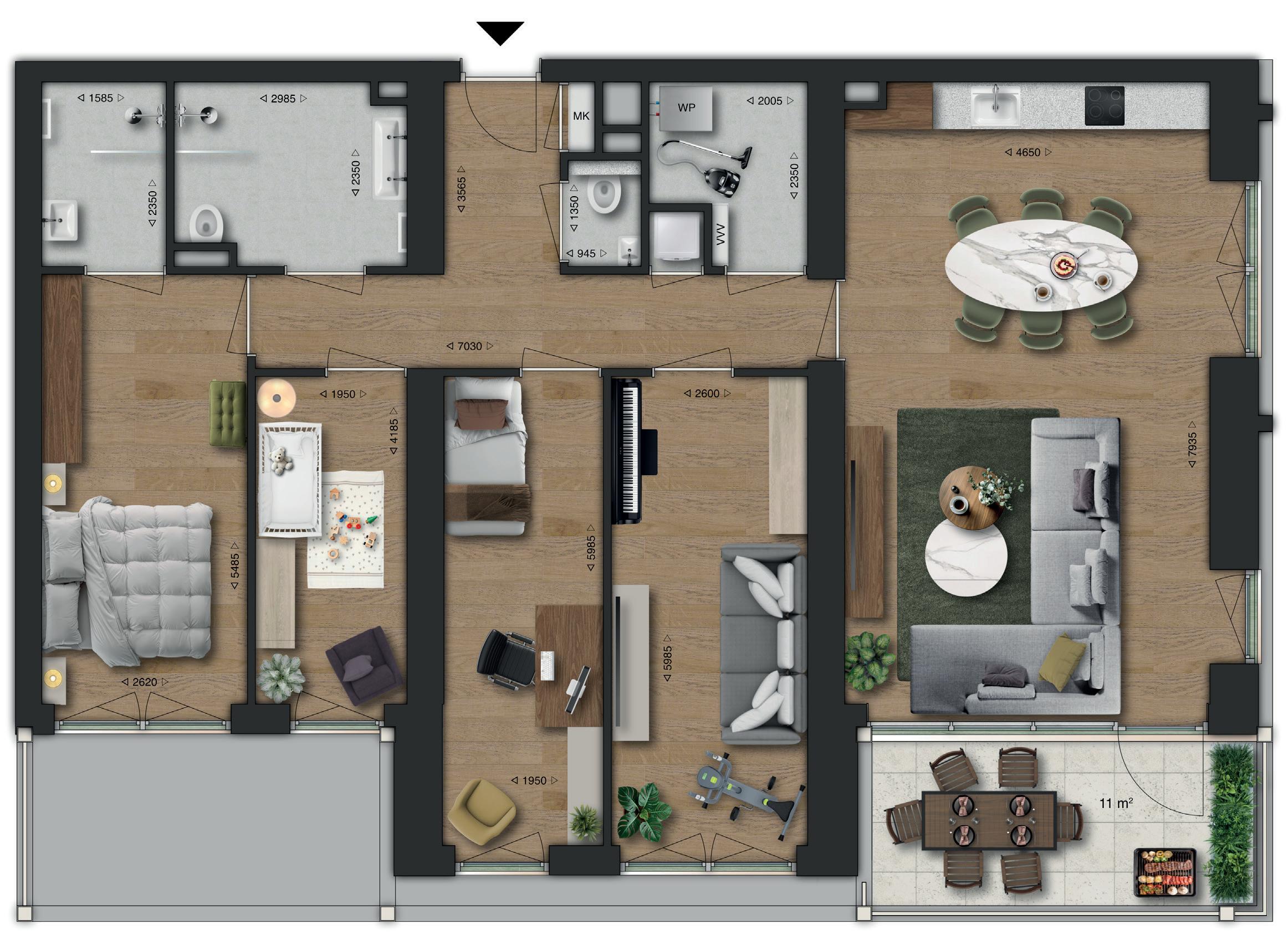 Dit is het grootste appartement van Woodstock, en dat voel je meteen. Type F is een vijfkamerhoekappartement met vier slaapkamers en een royale woonkamer met open keuken. Hier vind je alle ruimte voor een groot gezin, een thuiswerkopstelling, hobby’s en logees, of gewoon heel veel ademruimte.