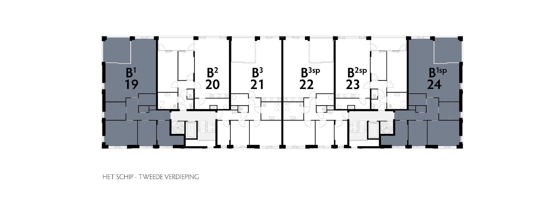 In gebouw Het Schip komen 22 royale appartementen verdeeld over 5 typen. Het gebouw telt vier woonlagen en een onderliggend souterrain. Vooral de grote raampartijen en opvallende loggia’s bepalen het stoere aanzicht van het gebouw. In het deels half-verdiepte souterrain van het gebouw vind je de bergingen en overdekte parkeerplaatsen. Op de drie woonlagen daarboven bevinden zich op elke woonlaag 6 appartementen in verschillende afmetingen. Op de bovenste woonlaag bevinden zich vier geweldige penthouses met een royaal dakterras.
