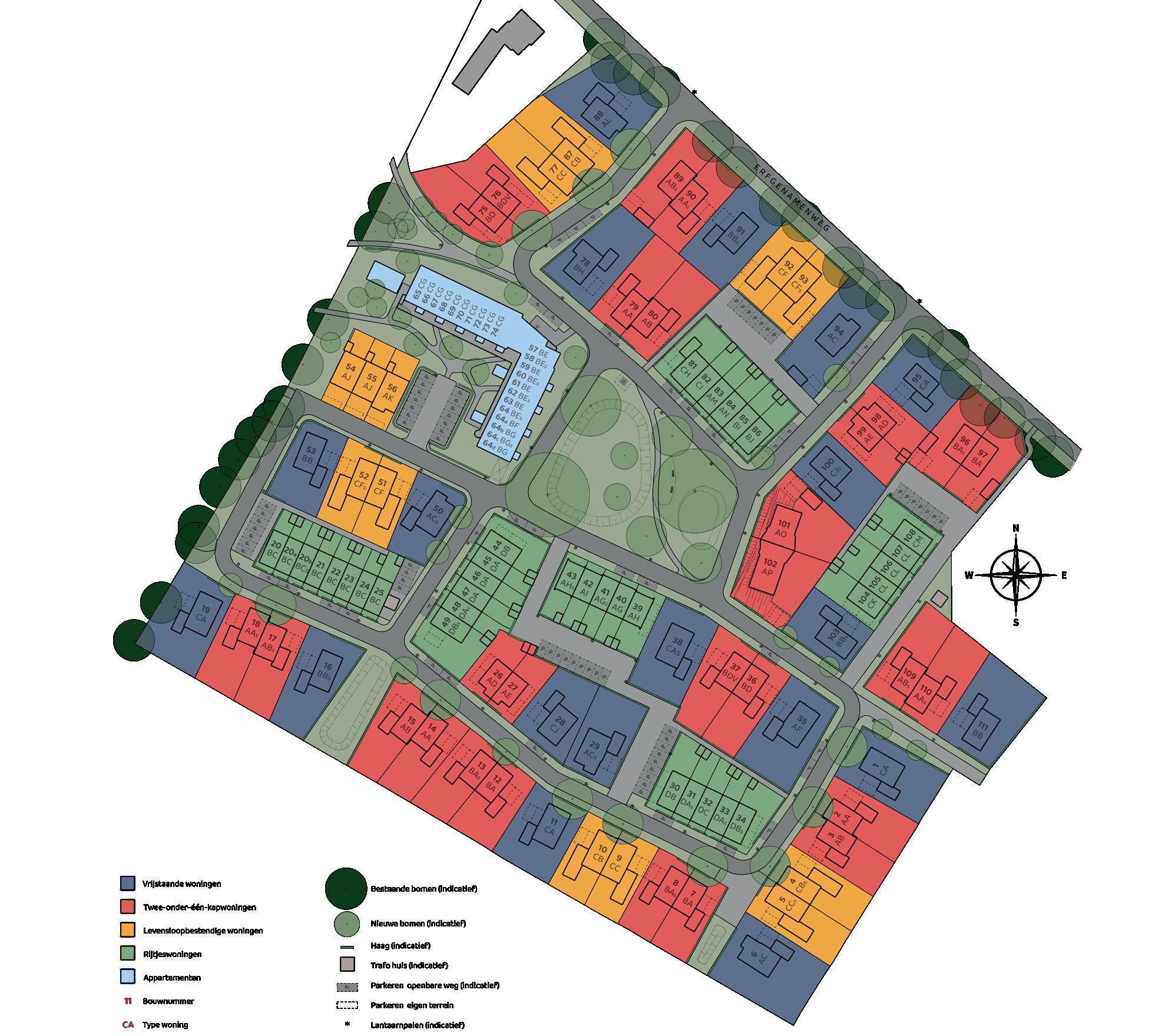 Deze verkoopdocumentatie is nauwkeurig en met zorg samengesteld aan de hand van gegevens en tekeningen, verstrekt door diverse partijen zoals gemeente, stedenbouwkundige, architect, constructeur, etc. Alle in deze brochure weergegeven artist- en sfeerimpressies, kleurstellingen, impressie van de openbare ruimte en perspectieftekeningen dienen als indruk, waaraan geen rechten kunnen worden ontleend. De op tekening aangegeven apparatuur, technische installaties, interieursuggesties, binnendeuren, maten en oppervlakten etc. dienen alleen ter oriëntatie. De nummers bij de woningen, zoals deze op de tekeningen staan aangegeven, zijn bouwnummers. De ontwikkelaar behoudt zich het recht om wijzigingen door te voeren in woningtypes op de verschillende kavels. Deze brochure is géén contractstuk en hieraan kunnen derhalve ook geen rechten worden ontleend. Bij de makelaar zijn de contractstukken beschikbaar.