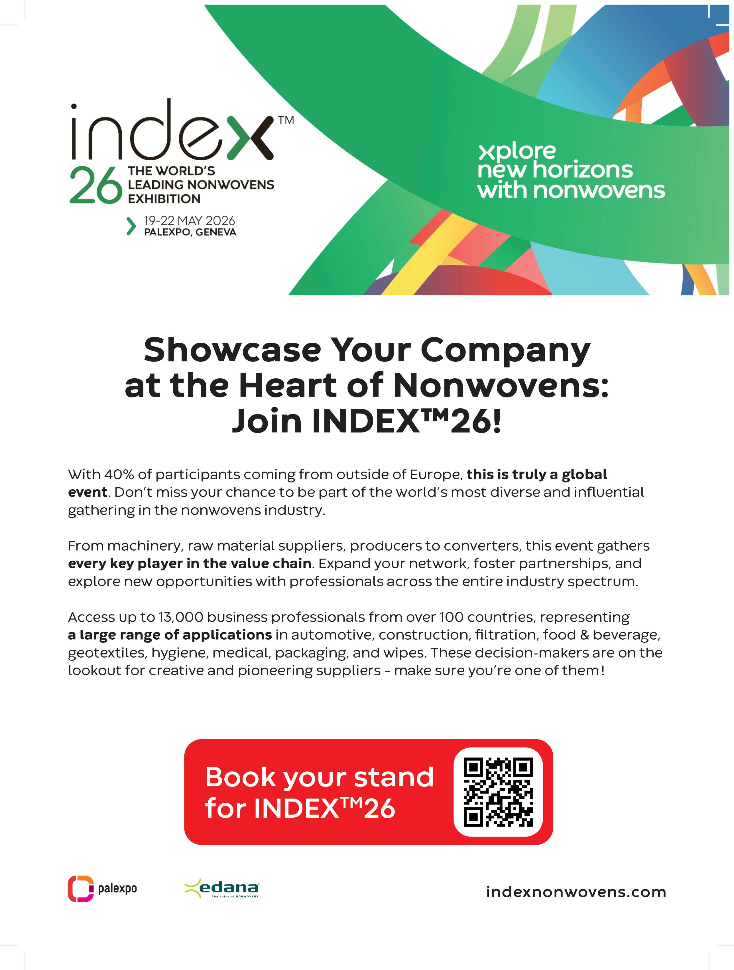 INDEX 2026—the world’s leading nonwovens exhibition—will also bring together raw material suppliers, machinery manufacturers, converters, and brand owners and place end-use applications firmly at the center of the conversation.
