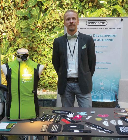 industry and academia. The bottom line is that research and innovation will decline without the very real possibility of achieving scale and commercialization. Cooperation enables the scaling of ideas, as illustrated by a joint paper from Tuomas Happonen, VTT Technical Research Center of Finland, and Mikko Paakkolanvaara, Screentec. Their paper, “Stretching reliability of SMD electronics integrated on elastic fabric,” discusses the manufacturing flow of integrating surface-mounted devices (SMDs) into the stretch fabric. This process is based on printing, converting, and assembly to integrate rigid SMD electronics exploiting novel material solutions such as stretchable inks and adhesive bonding technology needed to achieve the required electromechanical performance at low processing temperatures. SMD thermistors, printed wiring, multiple materials, and design configurations were integrated on both thermoplastic polyurethane (TPU) and a stretch fabric using a TPU lamination process. Tests and electromechanical characterization revealed the importance of material stack strengths and the layout design. The overall results were positive, and in maximum stretch tests, 100% stretchability without catastrophic failure was achievable.