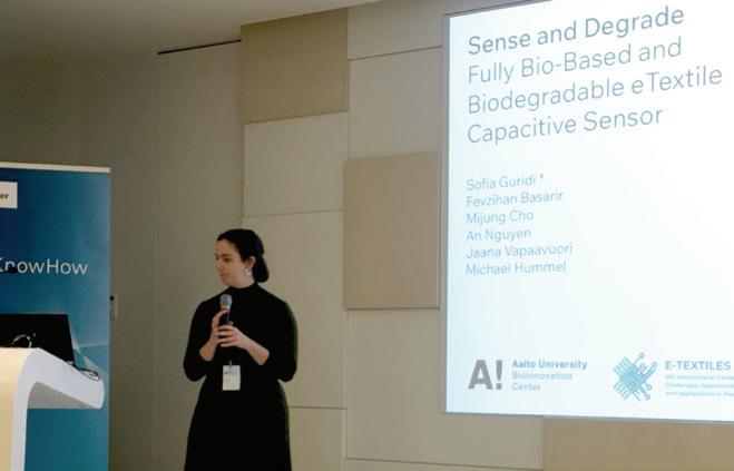 Sofia Guridi is speaking at E-Textiles Conference 2024, and the opening slide shows the final prototype of her biodegradable e-textile capacitive sensor. The sensor uses wool yarn and CMC films to create a textile pocket, where the sensor’s core is introduced.