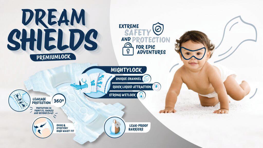 Dreamshields ® technology integrates a range of advanced features that benefit both parents and babies, enhancing comfort, protection, and ease of use. Panel scores show Dreamshields® performs great, especially when it comes to leakage protection. These innovations address both the needs of babies for comfort and the expectations of parents for reliability and sustainability: