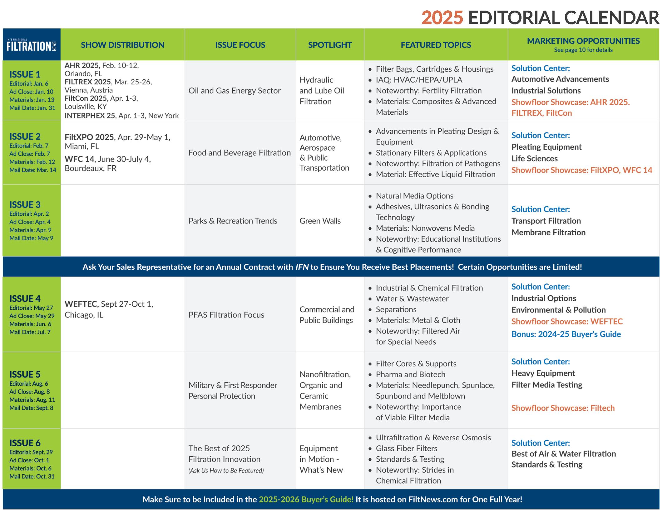 Setting yourself up for new opportunity is best done by pursuing the low hanging fruit. This is often found at the industry’s key events, where researchers, educators, engineers, innovators, end-users and vendors all gather to recognize thought leadership and innovation. This year, we have identified seven shows that we feel are relevant to our readership. On page 37, we preview AHR Expo 2025 (February 10-12, Orlando, FL), FILTREX 2025 (March 25-26, Vienna, Austria), FiltCon 2025 (April 1-3, Louisville, KY), INTERPHEX 25 (April 1-3, New York), FiltXPO (April 29May 1, Miami Beach, FL), 14th World Filtration Congress (June 30-July 4, Bourdeaux, France) and WEFTEC 2025 (September 27-October 1, Chicago, IL). This show guide will help you plan your year, and make sure you are in the right place at the right time!