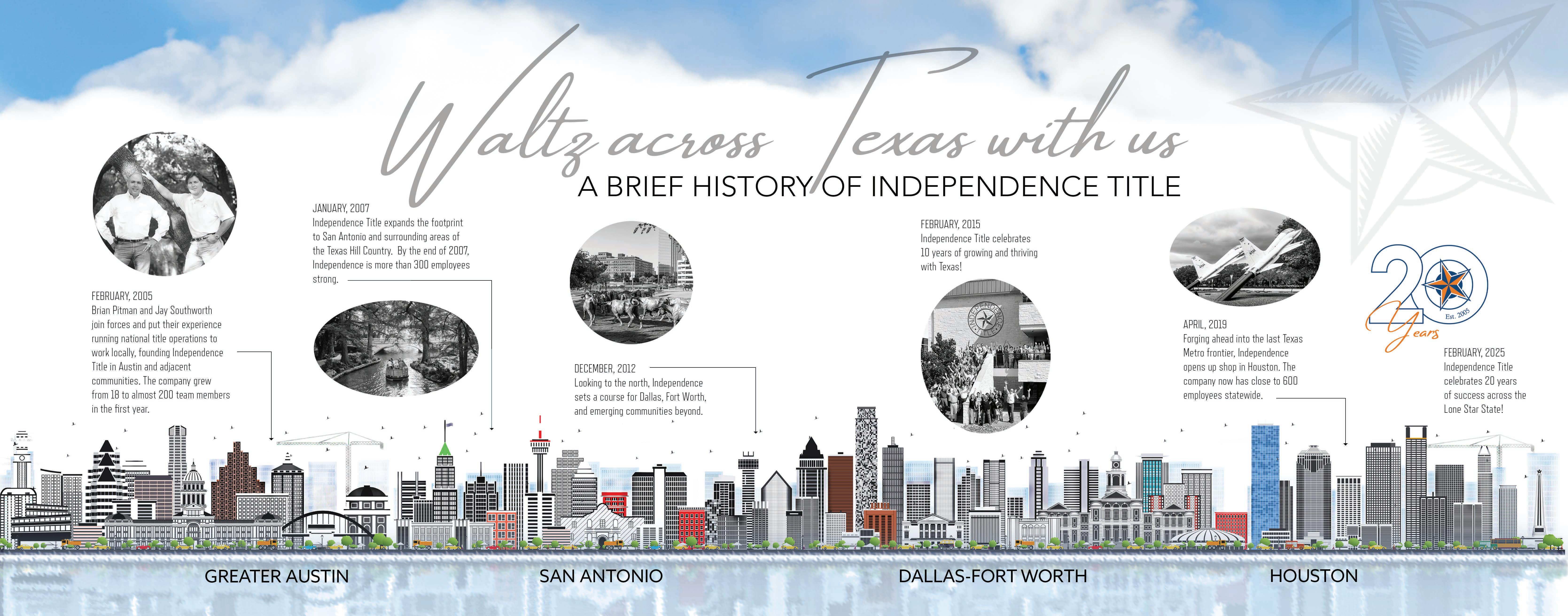 Independence Title is born and raised in Texas, founded in Austin in 2005 by Brian Pitman and Jay Southworth, with deep roots in the communities we serve across the Lone Star State. We are a team of the best and brightest title professionals in all four Metro areas, with resources that run as deep and wide as Texas.