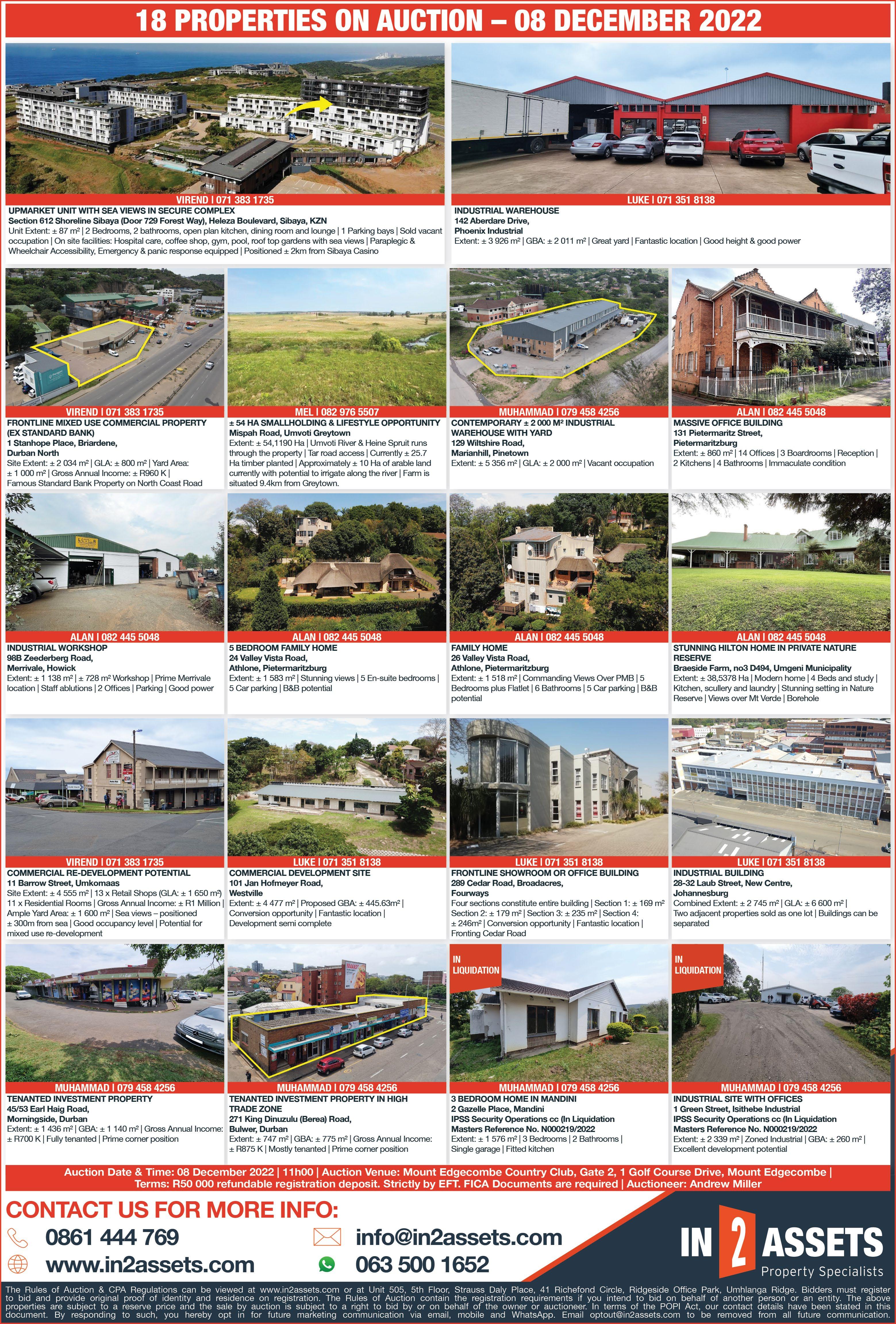 13 18 NOVEMBER 2022 Contact 0333971190 OR Danielle 0828016827 OR danielle@maskell.co.za • R50000 to obtain buyer’s card by EFT • 10% deposit payable by successful bidder on fall of hammer • FICA to be provided • Sale subject to confirmation • “above subject to change without prior notice” (E & Oe) • To be offered with and without the lease agreement(s) Duly instructed by the Trustees of Insolvent Estate D. Moodliar, Master’s Ref no.: D20022/2014 BIDDING OPENS TUESDAY, 6th DECMBER 2022 @ 12 NOON & CLOSES ON WEDNESDAY, THE 7TH DECEMBER 2022 FROM 12 NOON Bid online via our APP https://bidlive.maskell.co.za Erf 593 Glenmore (1424sqm): 593 Cooling Road Munster, Port Edward: Split level dwelling And Portion 0 of Erf 3404 Shallcross Ext.6 (2866sqm): 5 200116 Street, Shallcross, Durban: Undeveloped vacant stand https://online.flippingbook.com/view/61043130/ URGENT INSOLVENCY AUCTION OF UNDIVIDED HALF SHARES IN A SPLIT LEVEL D WELLING WITH LOCK -UP GARAGE LOCATED IN GLENMORE, PORT ED WARD AND A 2866sqm DEVELOPMENT STAND LOCATED IN SHALLCROSS, QUEENSBURGH Obo the Provisional Liquidators of RM General Trading (Pty) Ltd, Master's Ref.: D000033/2022 Contact Danielle (Candidate Property Practitioner) on 082 801 6827 / danielle@maskell.co.za • R50 000 buyer's card deposit payable by EFT • 10% deposit payable on fall of hammer • FICA to be provided • “Above subject to change without prior notice • Sale subject to confirmation (E&OE) Bidding opens 14th DEC 2022 at 12 noon & closes from 12 noon, 15th DEC 2022 URGENT TIMED ONLINE AUCTION OF A 3-BEDROOM UNIT LOCATED WITHIN A NEAT AND SECURE COMPLEX KNOWN AS HAPPY DAYS, HIBBERDENE
