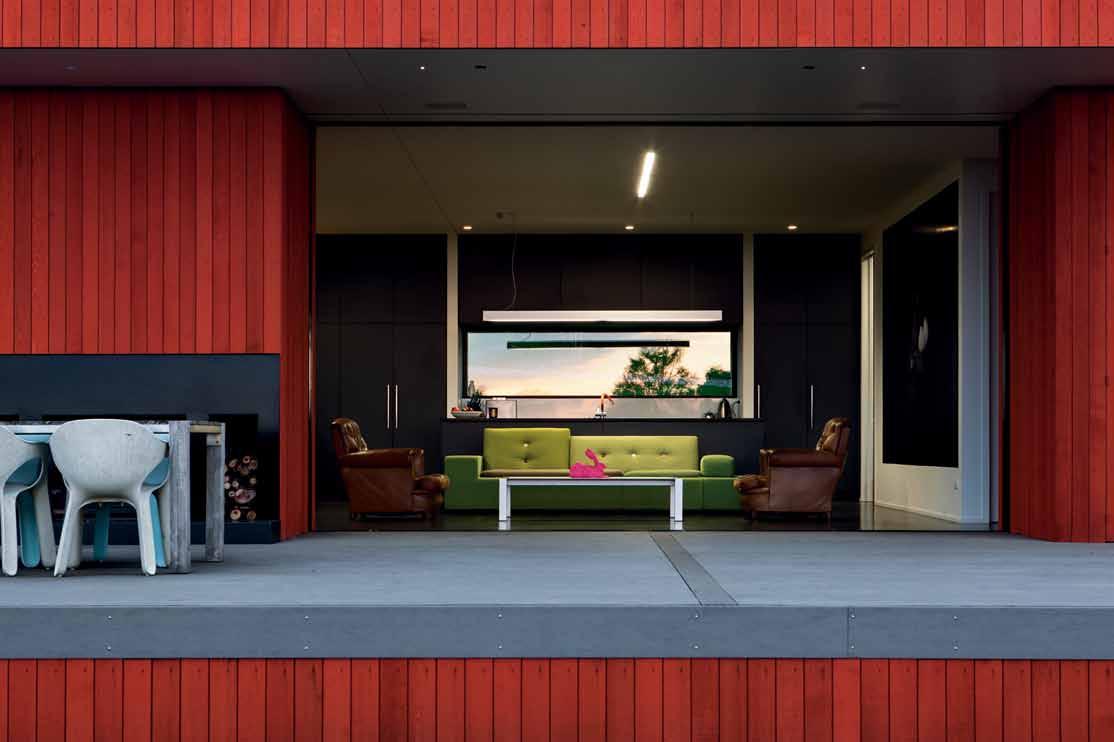 In terms of sustainability, all the boxes have been ticked. From the materials used to the level of insulation and advanced mechanical systems, every aspect of the home has been considered to ensure an undemanding environmental footprint. Requiring a great deal of coordination between trades was the installation of an in-floor geothermal ground source ventilation system, explains Geoff. “Working with a burnished concrete floor that could not be patched later, there was no room for error,” he says. Geoff adds that double glazing to European standards, design and specification throughout, along with a hydronic underfloor heating system and heat pump hot water systems are just a few examples of how the home was built with the future in mind. Carefully considered vents underneath fixed panels on the south side also allow fresh air into the house without pulling rain inside, while highly efficient glass sliding doors from Switzerland and louvres from Germany further establish a strong connection to the stunning landscape outside.