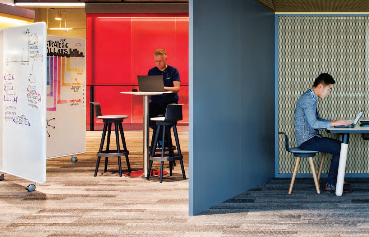 a desk for focused work, collaborating with colleagues, socialising with clients, delivering presentations, working remotely – the choice is entirely theirs.