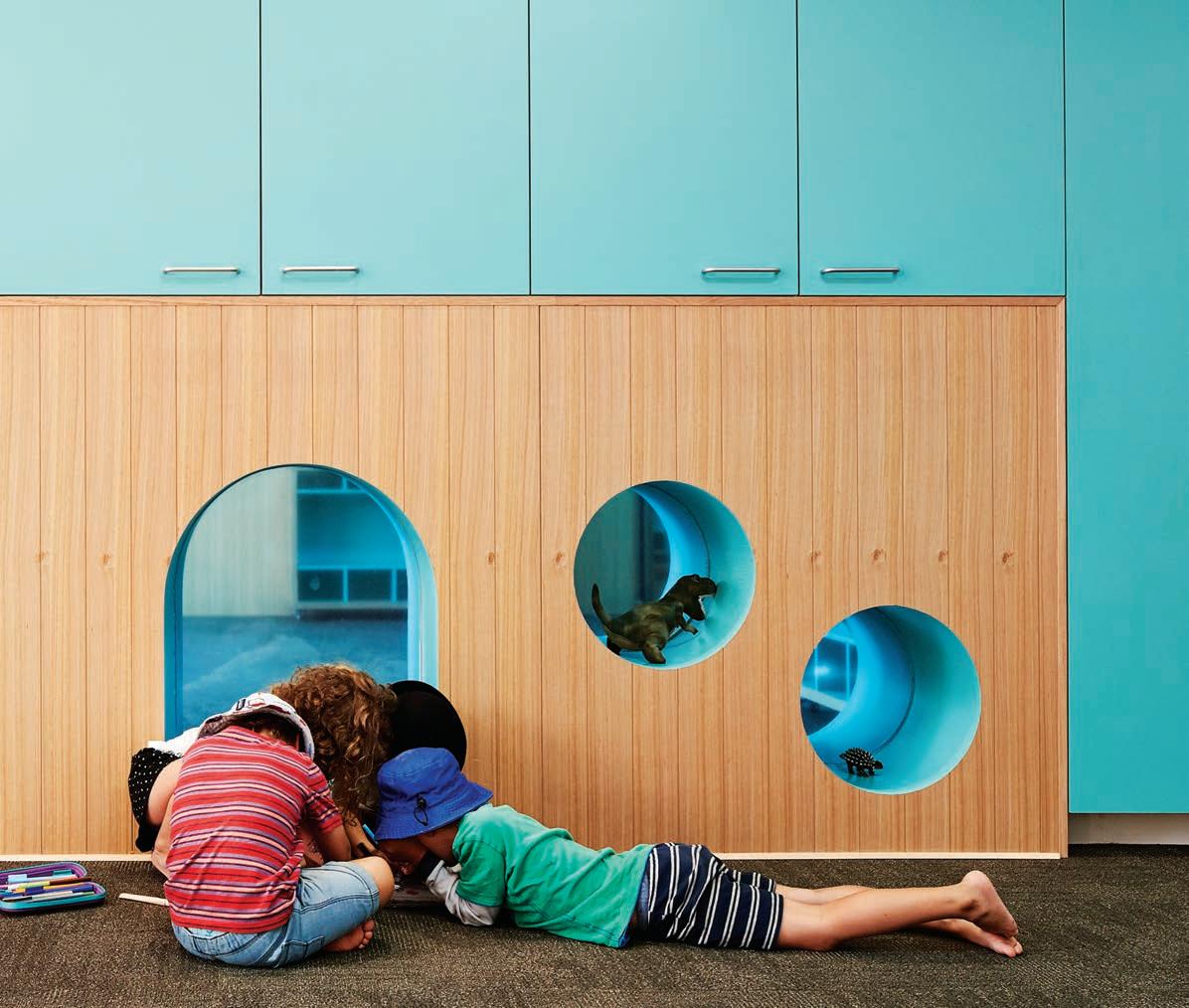 The building is designed from the children’s point of view with design tools such as colour used to help them recognise relevant spaces and promote a sense of belonging and ownership. Timber panels extending one metre up the wall create a warm and welcoming environment, with select joinery and colour used to identify places for storing belongings and toys. NEST selected teal as a relaxing colour that stimulates creativity, while red-orange tones were used sparingly. Portholes and arches are carved into interior and exterior walls for children to inhabit, play with and peek through. “It’s about giving them spaces they feel they can have ownership of,” says Fuscaldo.