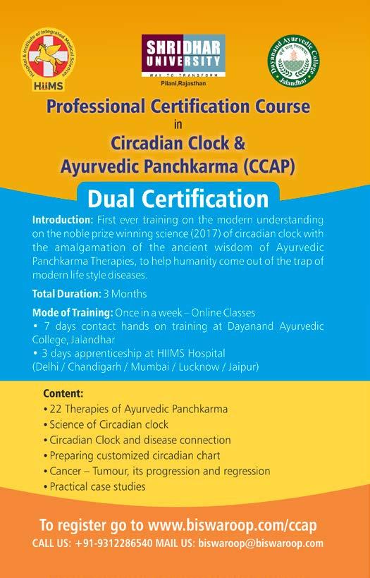 Dr. Biswaroop Roy Chowdhury has developed a protocol called the Circadian Chart, where he has integrated the modern evidence base of the Circadian Rhythm with the ancient wisdom of Ayurvedic Panchkarma to get a patient-centric outcome. This book explains the scientific bases of the Circadian Chart, and is a part of the Circadian Clock & Ayurvedic Panchkarma (CCAP) Dual Certification Course. This easy-to-understand book can help patients to prepare their own Circadian Chart and get rid of the Chronic and Lifestyle oriented diseases.