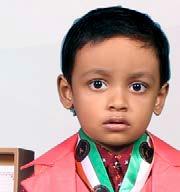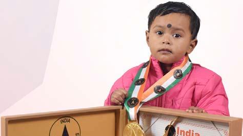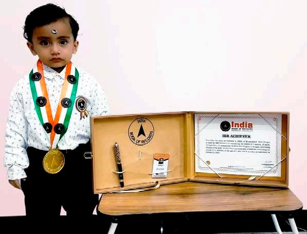 Shekhar Kumar Sahu (born on September 10, 2022) of Mayurbhanj, Odisha, is titled as ‘IBR Achiever’ for identifying 29 colours, 15 flowers, 19 birds, 35 fruits, 25 parts of the body, 25 freedom fighters, 26 animals and 12 games; reciting letters of the English alphabet, 7 English nursery rhymes, 10 shlokas and 8 planets; counting from 1 to 50; recalling 28 Indian states with capitals, 33 English antonyms and 25national symbols; answering 70 G.K. questions, at the age of 2 years and 10 months, as confirmed on