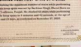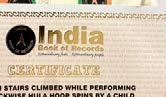 The record for climbing the maximum number of stairs while performing anticlockwise hula hoop spins was set by Sachiaar Singh Oberoi on March 8, 2018) of Ludhiana, Punjab. He climbed 63 stairs while performing anticlockwise hula hoop spins in 5 minutes and 42 seconds, at the age of 7 years, 8 months and 19 days, as confirmed on November 27, 2025.