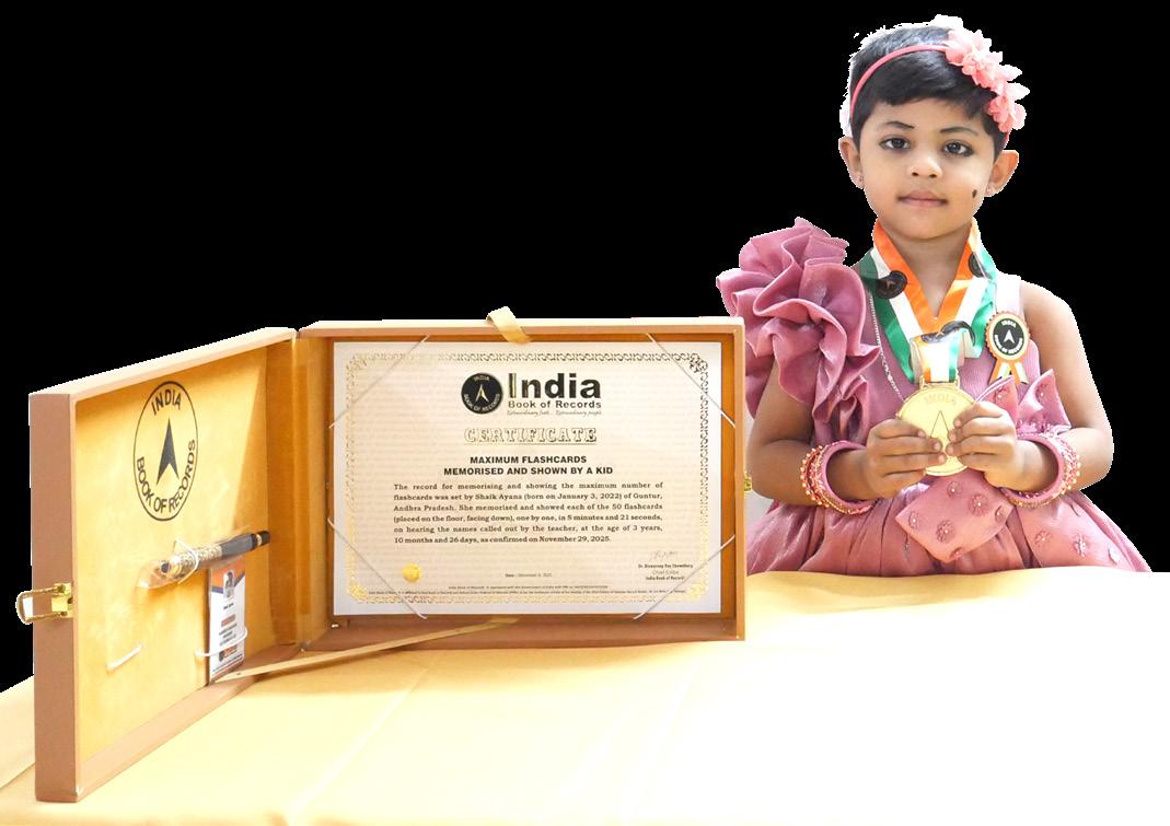 The record for memorising and showing the maximum number of flashcards was set by Shaik Ayana (born on January 3, 2022) of Guntur, Andhra Pradesh. She memorised and showed each of the 50 flashcards (placed on the floor, facing down), one by one, in 5 minutes and 21 seconds, on hearing the names called out by the teacher, at the age of 3 years, 10 months and 26 days, as confirmed on November 29, 2025.