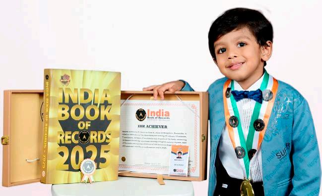 Manvik Aadheeran S. (born on June 6, 2022) of Bengaluru, Karnataka, is titled as ‘IBR Achiever’ for identifying and naming 10 colours, 15 vehicles, 7 continents, 10 types of machinery and 16 parts of the body; answering 10 General Knowledge questions; reciting 5 English nursery rhymes, days of the week; and running a distance of 100 metres in 36 seconds, at the age of 3 years and 1 month, as confirmed on July 9, 2025.