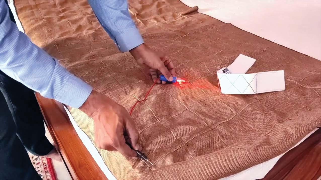To check the continuity, touch one of the terminals of the continuity tester with any of the wires on the zero-volt bed sheet, and the other terminal of the continuity tester with wires anywhere on the bedsheet. The moment you touch it, the red light will blink. This will be proof that your zerovolt bed sheet is conductive and all the wires are in continuity and the circuit is not broken. This test can be repeated by touching other wires on the bed sheet. If every time the light blinks it confirms that the bed sheet is conductive.