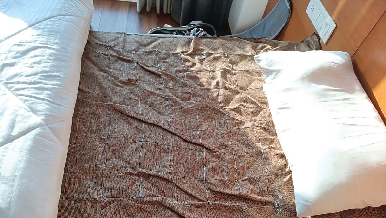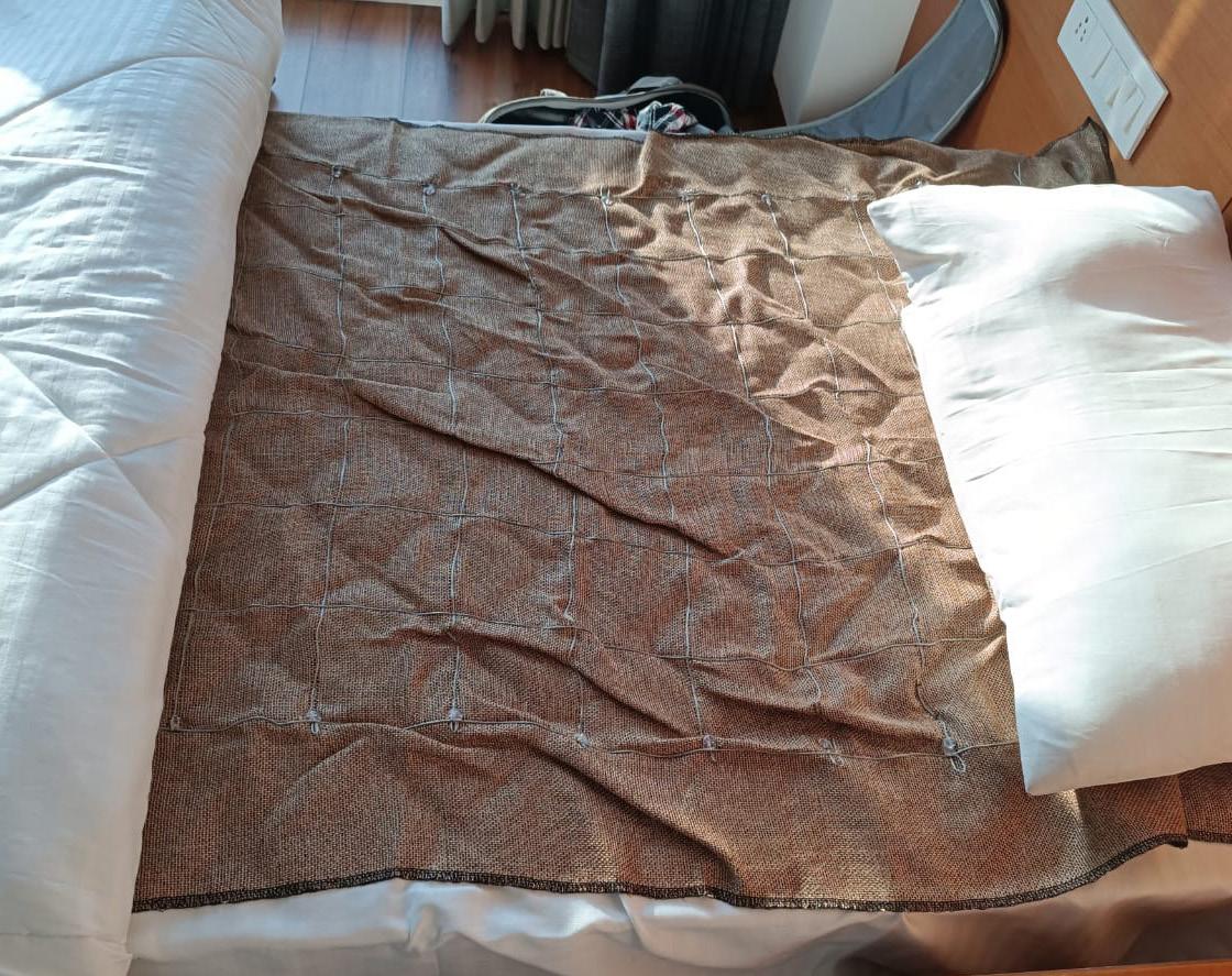 extension cord, or simply connect it directly if you are outdoors. But don’t forget to wear shoes. Also, you can use the socket, if it is working. Now, I will tell you about the Zero Volt Therapy bed sheet. On this bed sheet, there are multiple threads. These threads are made of copper and they are 1mm thick. Each thread is made of 16 finer threads, making it 1mm thick.
