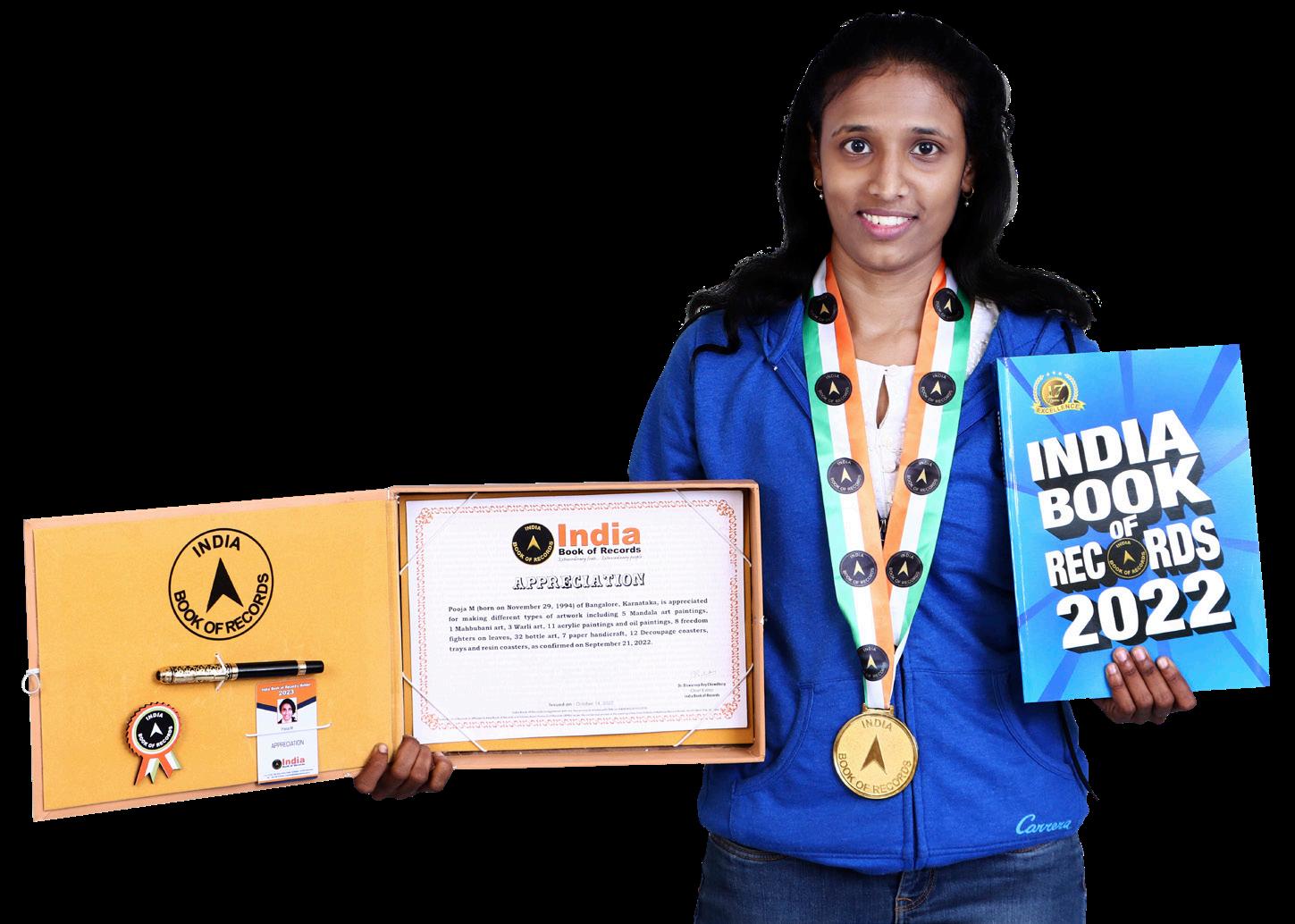 Pooja M (born on November 29, 1994) of Bangalore, Karnataka, is appreciated for making different types of artwork including 5 Mandala art paintings, 1 Mahbubani art, 3 Warli art, 11 acrylic paintings and oil paintings, 8 freedom fighters on leaves, 32 bottle art, 7 paper handicraft, 12 Decoupage coasters, trays and resin coasters, as confirmed on September 21, 2022.