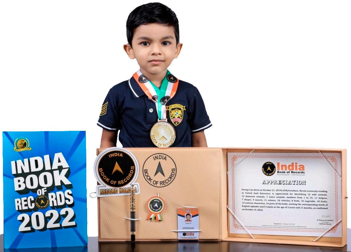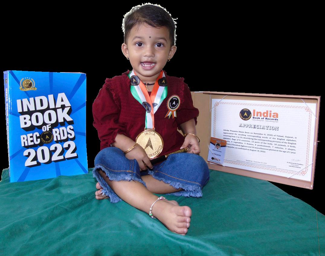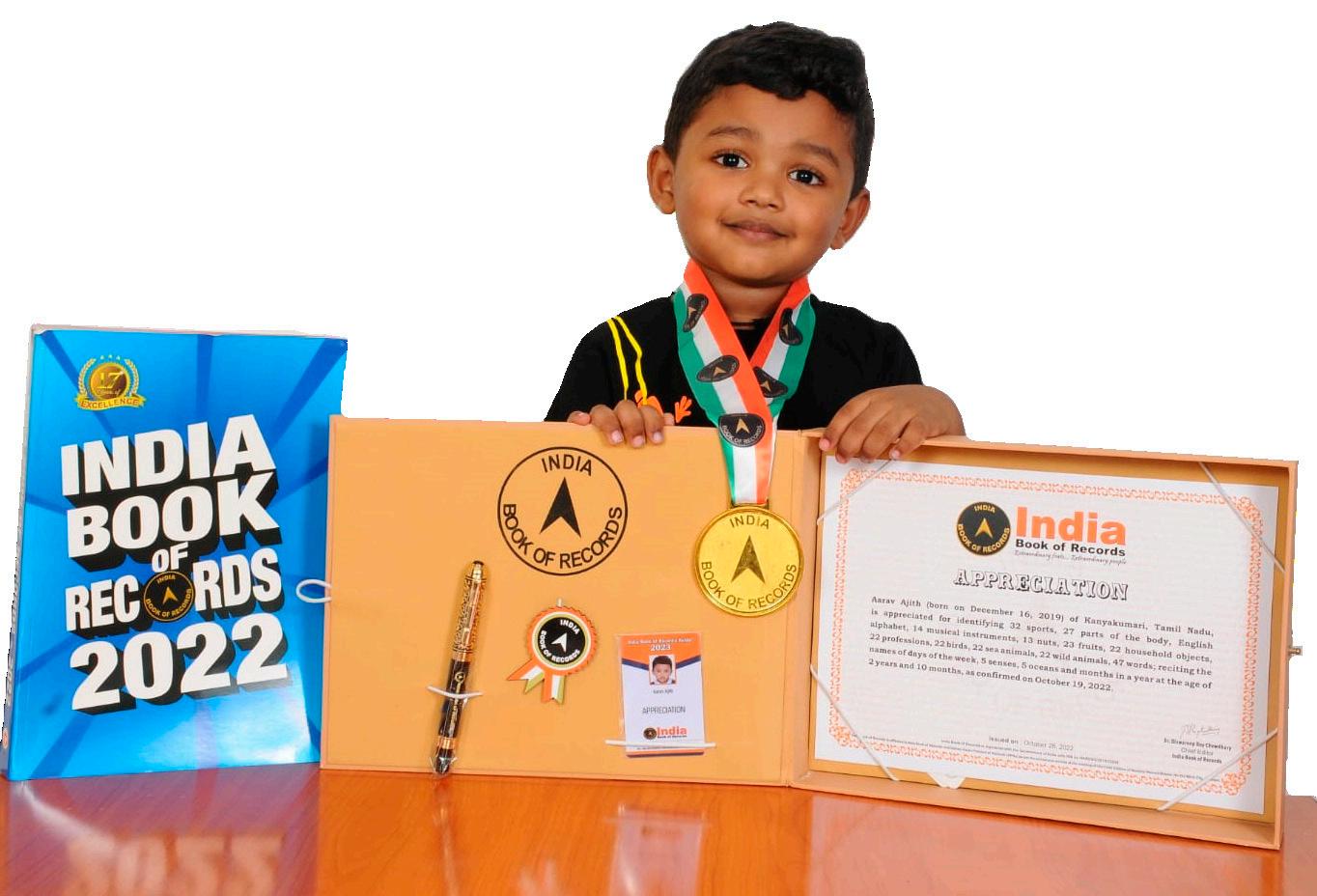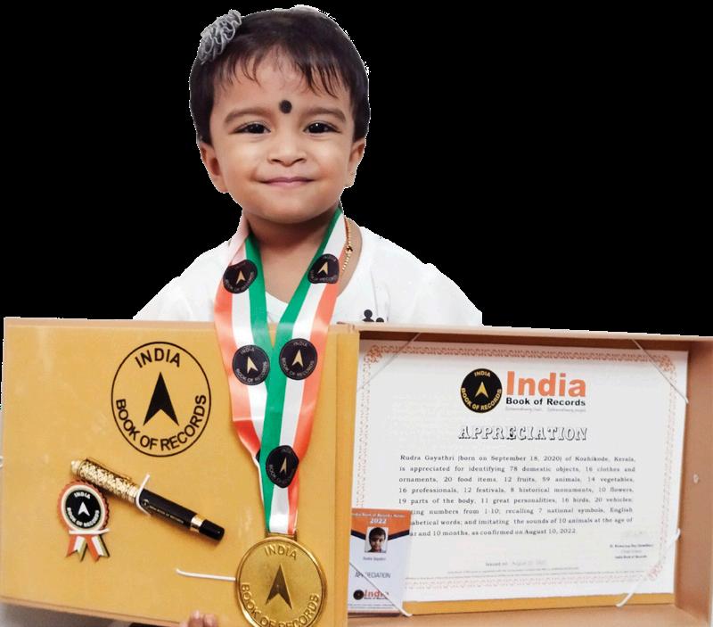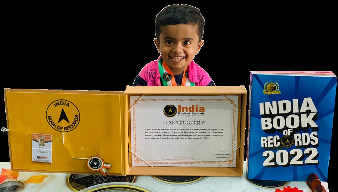 (born on December 10, 2020) of Malappuram, Kerala, is appreciated for identifying 36 birds, 25 fruits, 20 vegetables, 25 action words, 18 professionals, 23 animals, 19 flowers, 24 vehicles, 10 shapes, flags of 24 countries, 13 colours, 15 freedom fighters, 12 parts of the body, 88 random objects; and reciting letters of the alphabet from A – Z, along with 26 words, at the age of