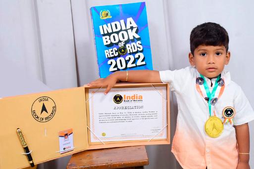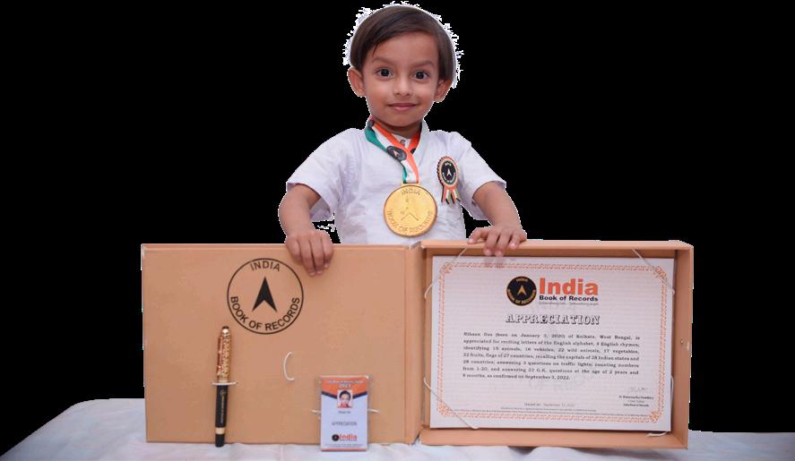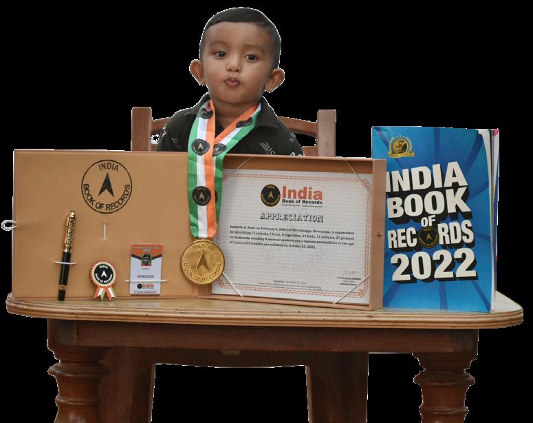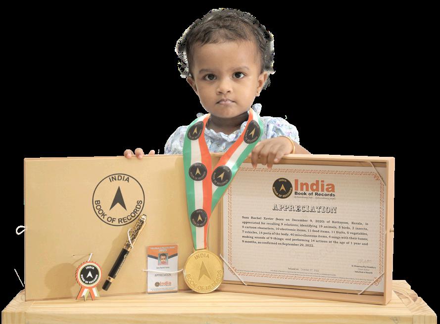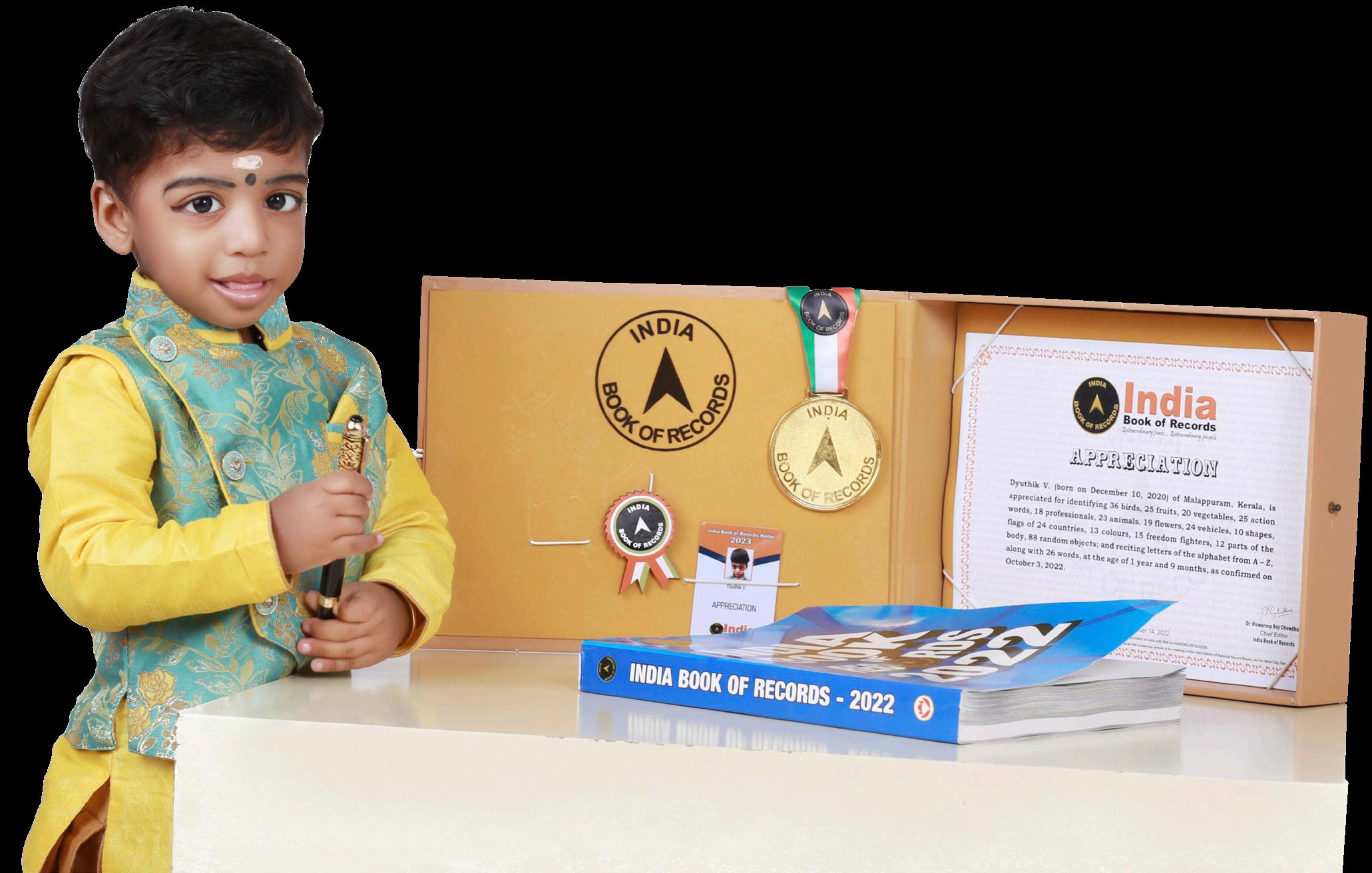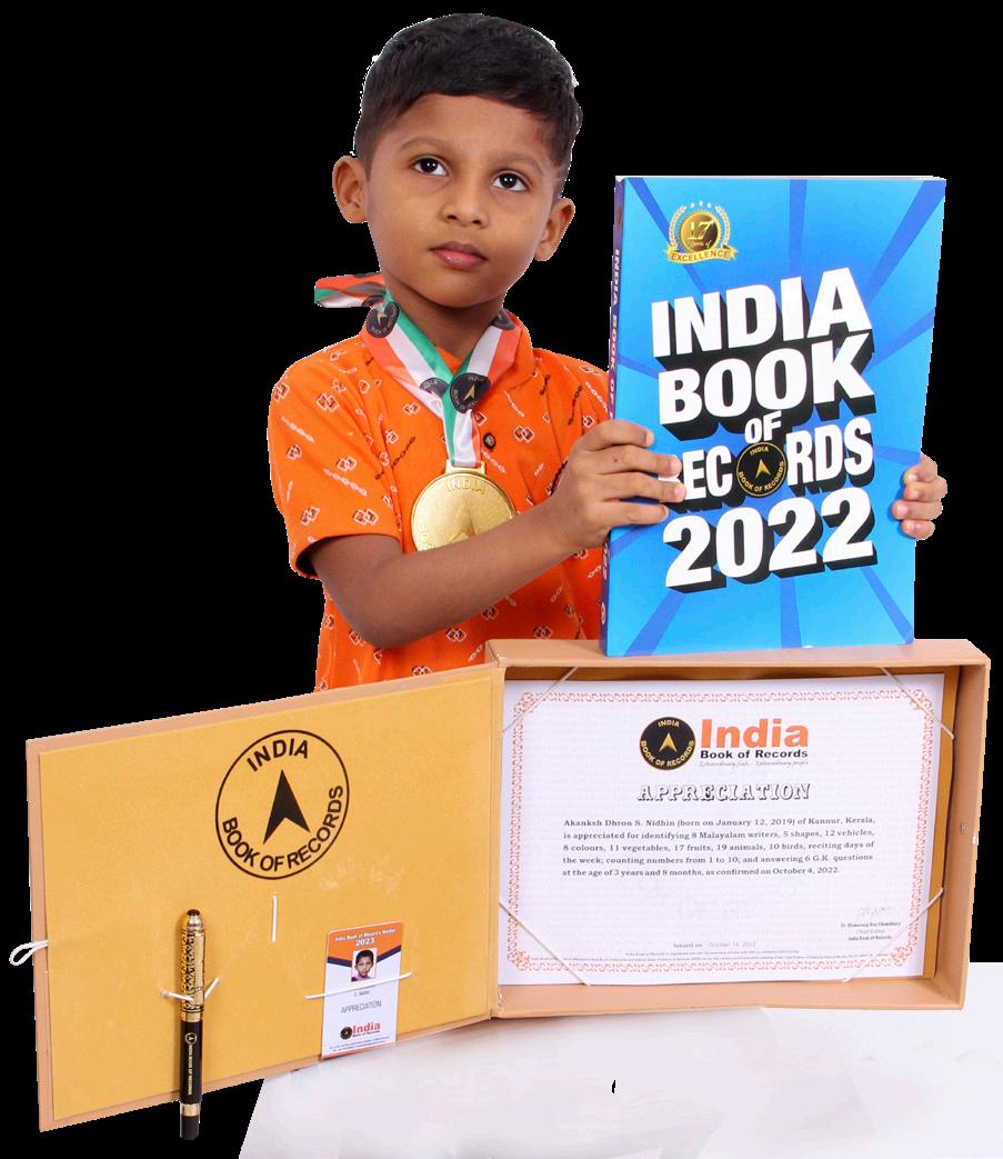 (born on December 10, 2020) of Malappuram, Kerala, is appreciated for identifying 36 birds, 25 fruits, 20 vegetables, 25 action words, 18 professionals, 23 animals, 19 flowers, 24 vehicles, 10 shapes, flags of 24 countries, 13 colours, 15 freedom fighters, 12 parts of the body, 88 random objects; and reciting letters of the alphabet from A – Z, along with 26 words, at the age of