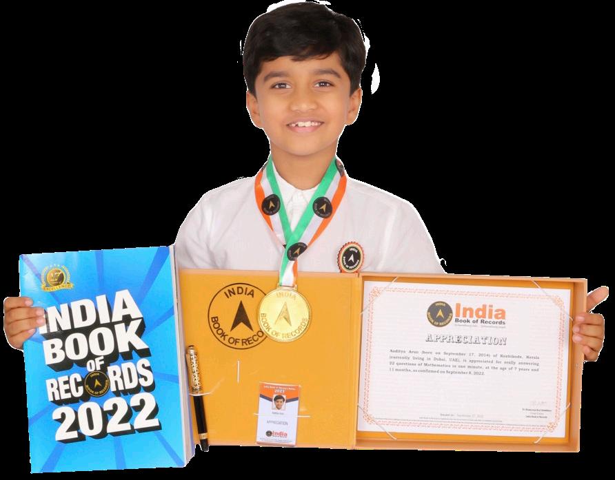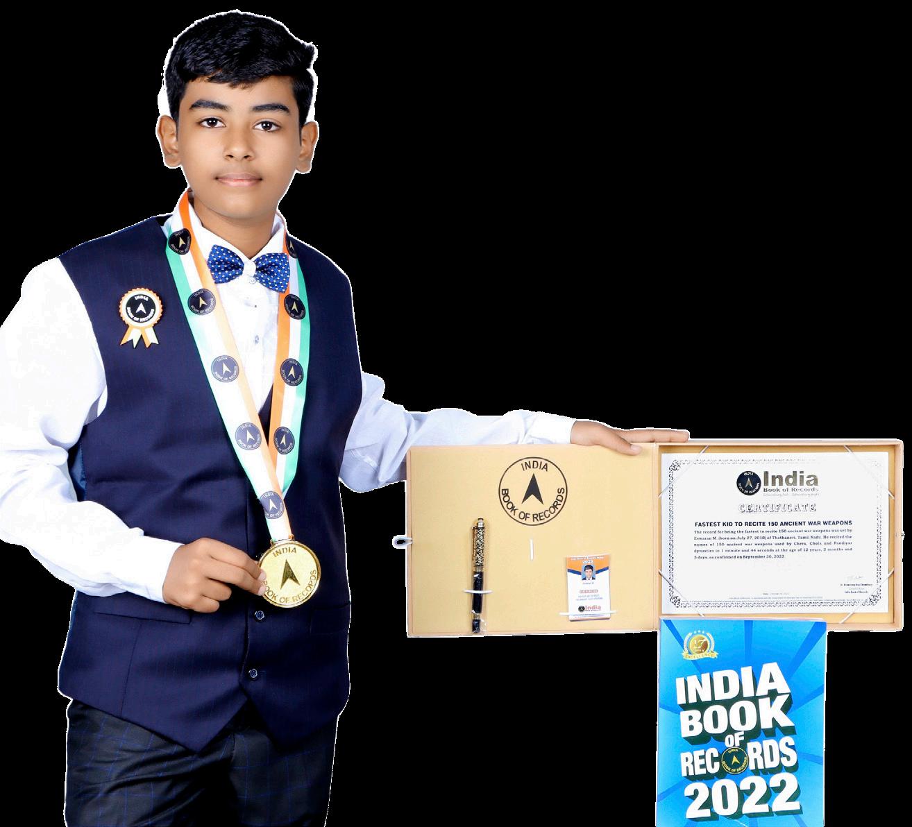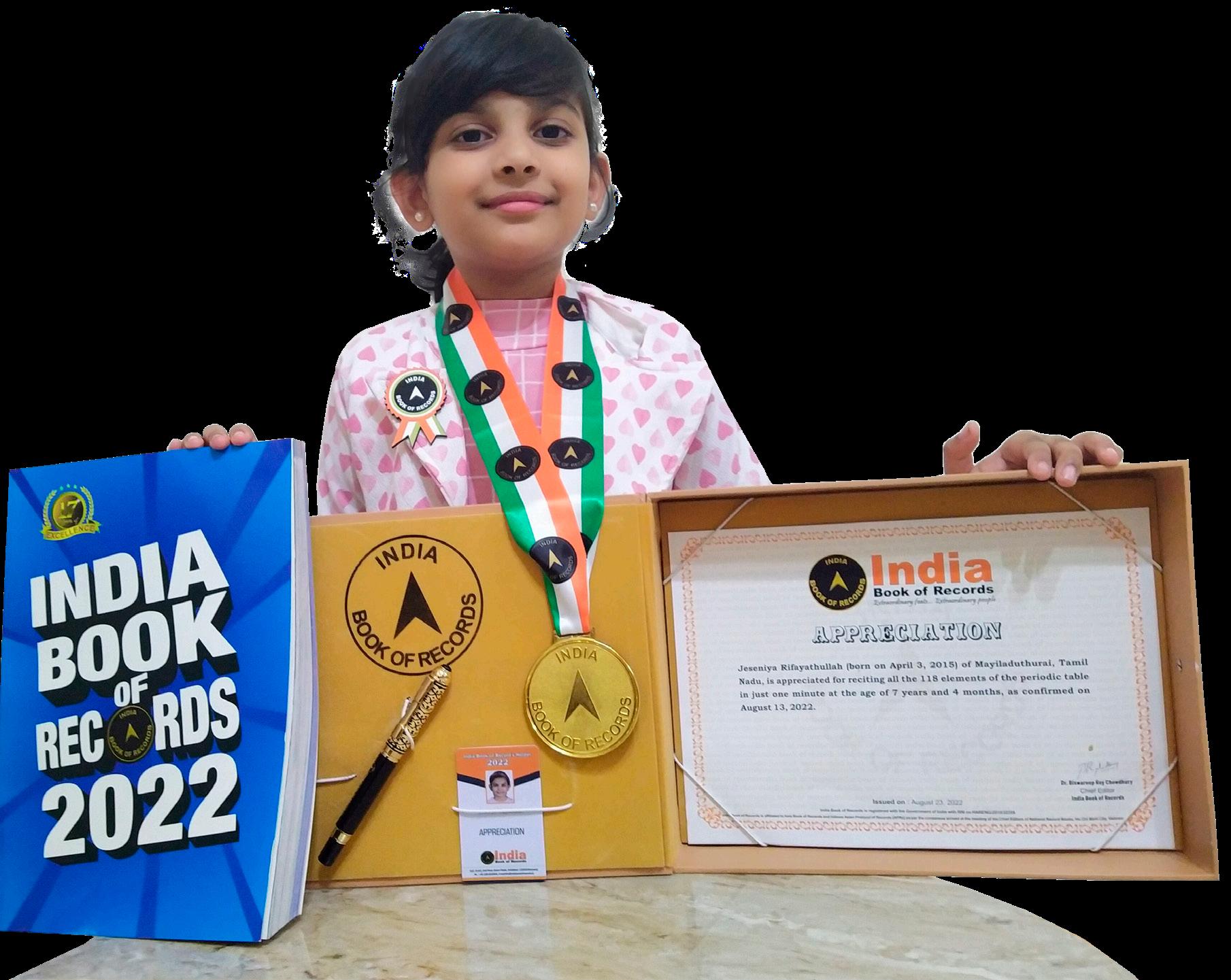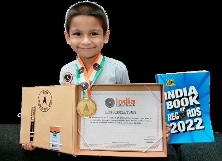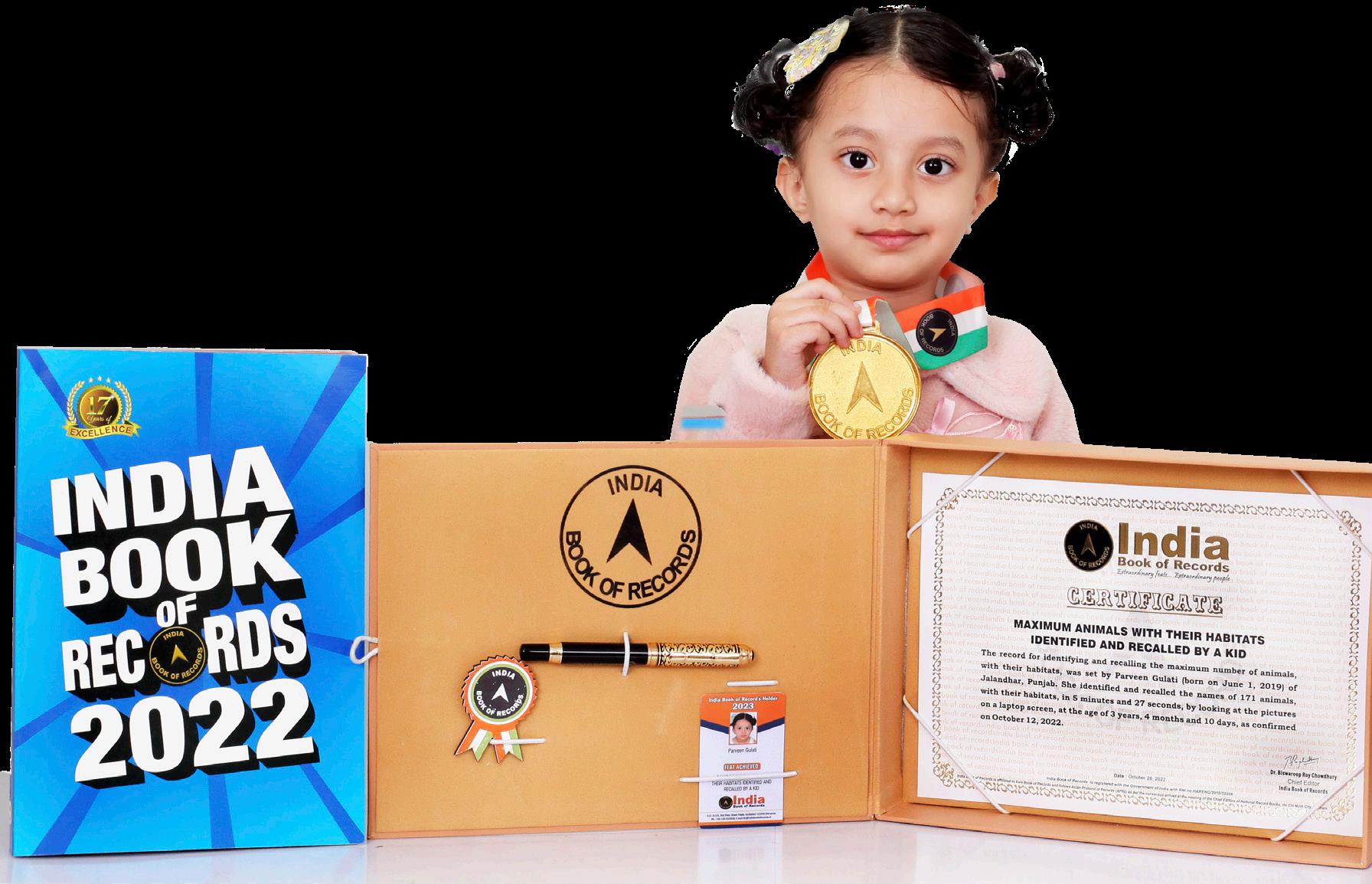 (born on December 10, 2020) of Malappuram, Kerala, is appreciated for identifying 36 birds, 25 fruits, 20 vegetables, 25 action words, 18 professionals, 23 animals, 19 flowers, 24 vehicles, 10 shapes, flags of 24 countries, 13 colours, 15 freedom fighters, 12 parts of the body, 88 random objects; and reciting letters of the alphabet from A – Z, along with 26 words, at the age of