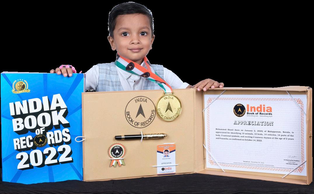 Mohammed Shazil (born on January 2, 2020) of Malappuram, Kerala, is appreciated for identifying 10 animals, 10 birds, 14 vehicles, 16 parts of the body, 5 national symbols; and reciting 2 nursery rhymes at the age of 2 years and 9 months, as confirmed on October 14, 2022.