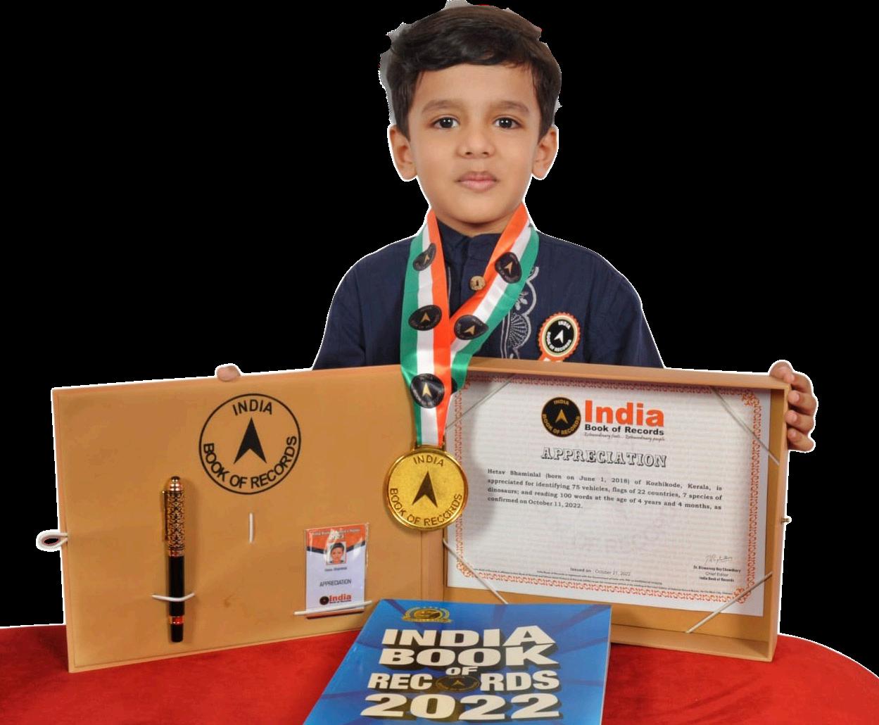 Hetav Shaminlal (born on June 1, 2018) of Kozhikode, Kerala, is appreciated for identifying 75 vehicles, flags of 22 countries, 7 species of dinosaurs; and reading 100 words at the age of 4 years and 4 months, as confirmed on October 11, 2022.