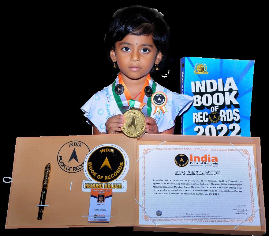 Tanvitha Sai K (born on July 20, 2018) of Guntur, Andhra Pradesh, is appreciated for reciting Gayatri Mantra, Lakshmi Mantra, Maha Mrityunjaya Mantra, Saraswati Mantra, Rama Mantra, Guru Brahma Mantra; recalling days of the week year, 28 Indian States and their age of 4 years and 3 months,