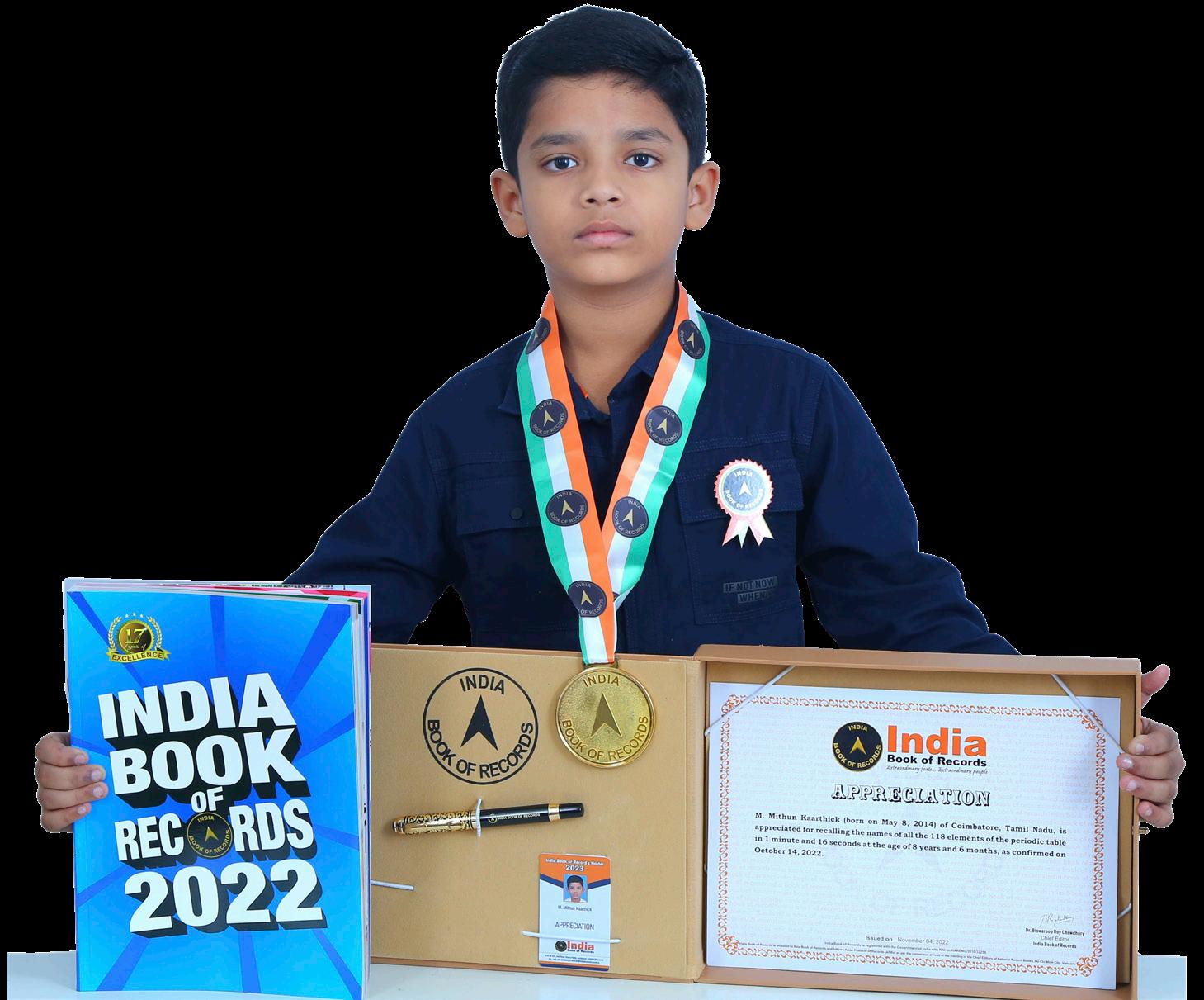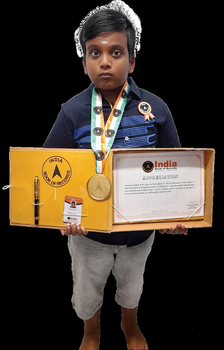 Lomash Lingam R.M. (born on November 10, 2013) of Chennai, Tamil Nadu, is appreciated for reciting the names of 130 birds in 1 minute and 59 milliseconds and multiplication tables from 1-12 in 1 minute and 57 seconds at the age of 8 years and 8 months, as confirmed on July 19, 2022.
