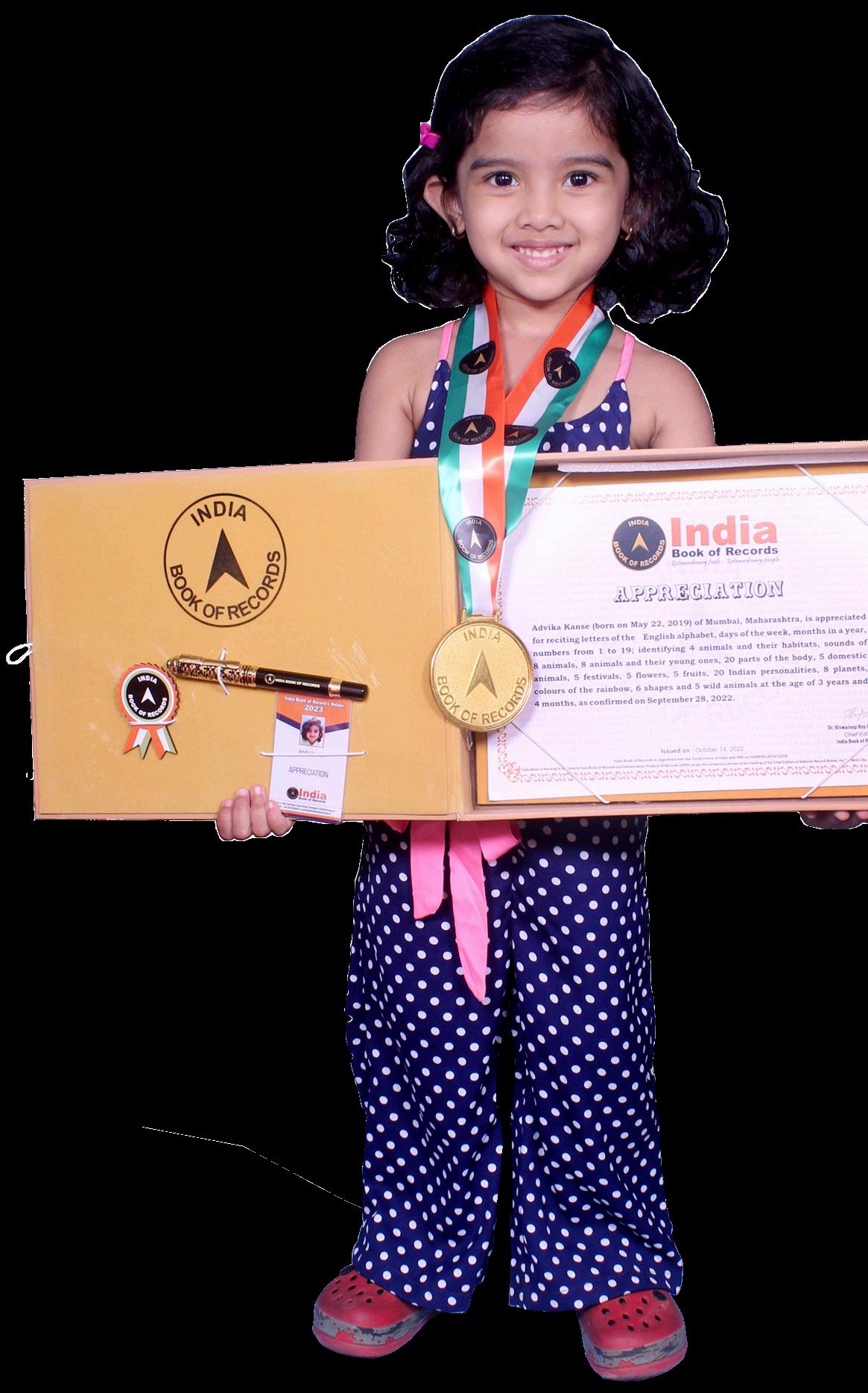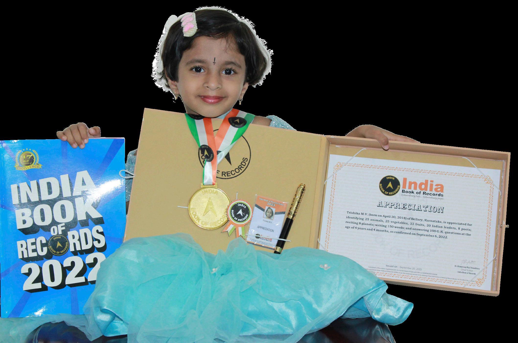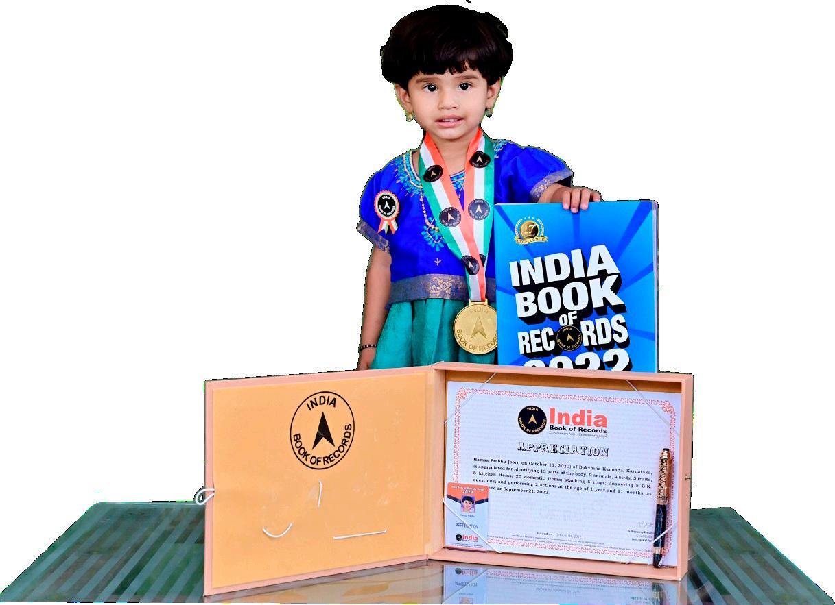 (born on November 23, 2019) of Kozhikode, Kerala, is appreciated for recalling the names of 14 Kerala state districts, 10 country names, 12 months, 7-weekdays, identifying 7 shapes, 8 insects, 13 fruits, 21 body parts, 9 flowers, 30 animals, 9 birds, 16 vegetables, 5 computer parts, 12 professionals, 6 festivals, 5 reptiles,12 vehicles, 10 home appliances, 111 objects and reciting 8 rhymes at the age of 2 years and 10 months, as