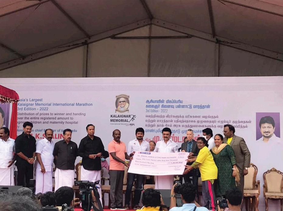 1.2 करोड़ रुपए का पंजीकरण शुलक प्रदान नकया। मुखयमंत्री सटासलन द्ारा चारों ्वगषों के न्वजेताओं को कुल 5 लाख रुपए की पुरसकार रासश न्वतररत की गई। मैराथन में, मभणचरण ने 5 नकमी श्रेणी में प्रथम पुरसकार जीता और 25,000 रुपये नकद पुरसकार प्रापत नकया। कोयमबटूर के सतीशकुमार ने 10 नकमी श्रेणी में प्रथम पुरसकार प्रापत नकया। पुदुकोट्टई के एक फौजी, लक्मण गोव्वतिद ने 21 नकलोमीटर की श्रेणी में 1 लाख रुपये का प्रथम पुरसकार जीता, और जयपुर के पुसलस कमशी शेर ससतिह ने 42 नकलोमीटर की श्रेणी में प्रथम पुरसकार जीता। स्वास्य न्विाग ने प्रनतिानगयों को प्रोतसानहत करने के सलए उरुमीमेलम, थुममबयाटम और पंबाई सनहत सांसकृनतक ग्ामीण कला प्रदश्डनों की िी व््वस्ा की थी। पपछले दो ्वषषों (2020 और 2021) में आयोभजत ्वचु्डअल मैराथन में कुल 80 लाख रुपए की िनरासश एकत्र हुई थी, भजसे कोन्वर राहत कोष में दान नकया गया। कलैगनार ििोररयल इंटरनेशनल िैराथन ने तमिलनाड के ओल्कॉट ििोररयल स्कूल ि एक वाम्षिक स्ारक िैराथन ि प्रमतभामगयों की अधधकति संख्ा के आधार पर ररककॉड बनाया, लिसि कुल 43,102 प्रमतभामगयों ने भाग ललया। 5 इंडिया बुक ऑफ रिकॉर्ड्स | दिििर 2022
