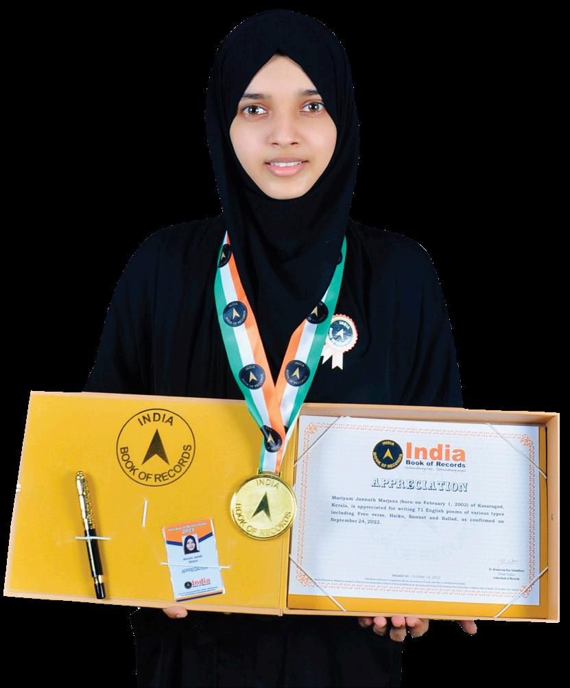 Mariyam Jannath Marjana (born on February 1, 2002) of Kasaragod, Kerala, is appreciated for writing 71 English poems of various types including Free verse, Haiku, Sonnet and Ballad, as confirmed on September 24, 2022.