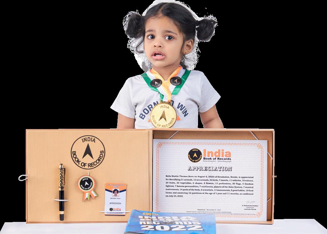 Bella Martin Thomas (born on August 6, 2020) of Ernakulam, Kerala, is appreciated for identifying 31 animals, 12 sea animals, 26 birds, 7 insects, 11 vehicles, 10 colours, 20 fruits, 20 vegetables, 6 shapes, 8 flowers, 13 professions, 20 flags, 5 freedom fighters, 7 famous personalities, 7 continents, planets of the Solar System, 7 musical instruments, 14 parts of the body, 6 scientists, 13 monuments, 5 good habits, 10 food