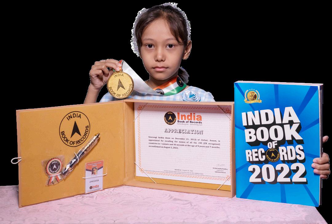 Gourangi Saikia (born on December 21, 2012) of Jorhat, Assam, is appreciated for recalling the names of all the 195 (UN recognised) countries in 1 minute and 50 seconds at the age of 9 years and 7