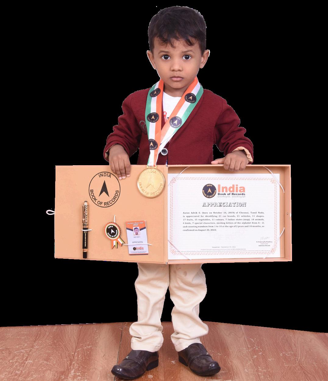 Adharv R. A. (born on September 19, 2020) of Thiruvananthapuram, Kerala, is appreciated for identifying the names of 5 animals, 8 fruits, 11 objects, 100 famous persons; and answering 5 G.K. questions at the age of 1 year and 9