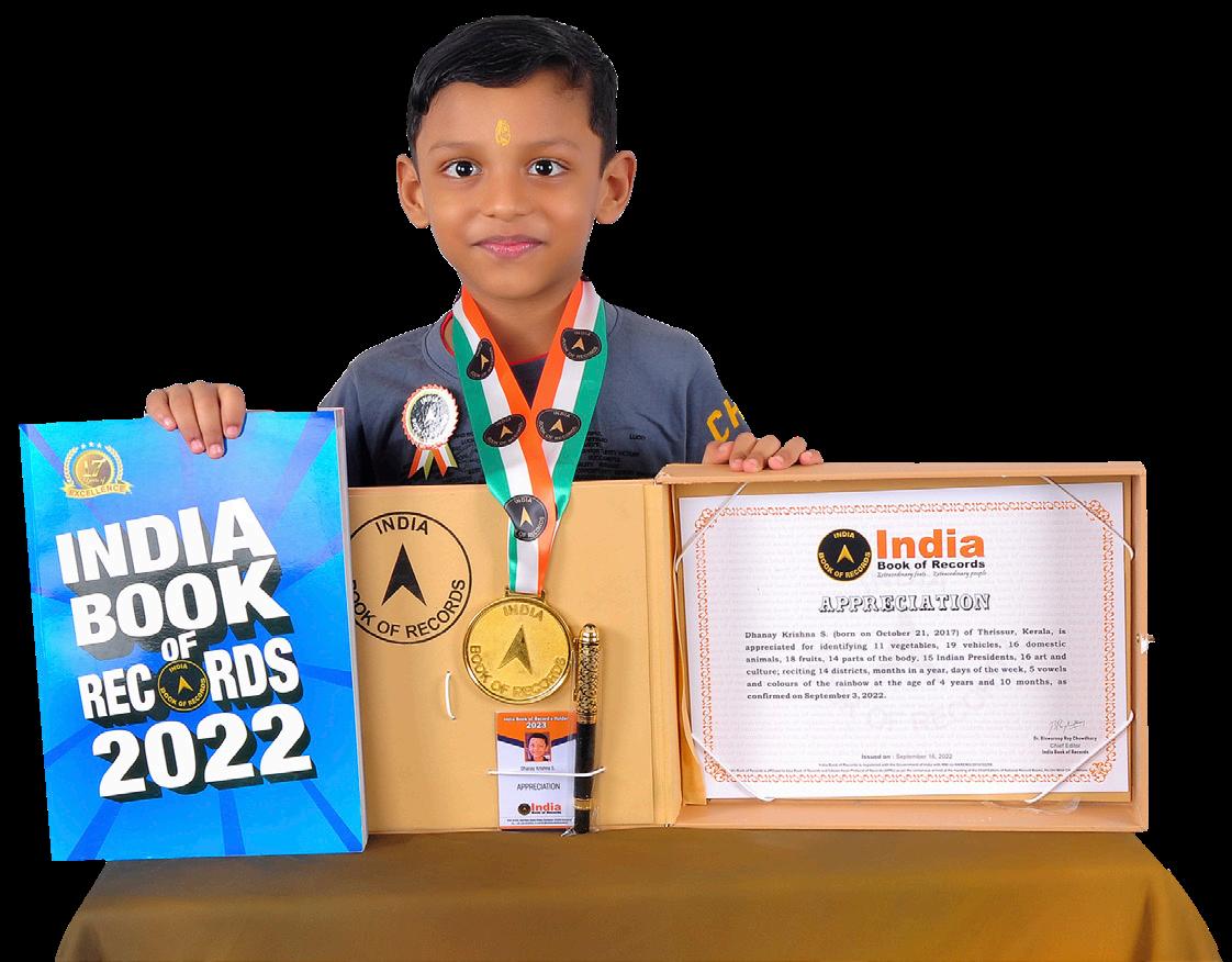 Dhanay Krishna S. (born on October 21, 2017) of Thrissur, Kerala, is appreciated for identifying 11 vegetables, 19 vehicles, 16 domestic animals, 18 fruits, 14 parts of the body, 15 Indian Presidents, 16 art and culture; reciting 14 districts, months in a year, days of the week, 5 vowels and colours of the rainbow at the age of 4 years and 10 months, as confirmed on September 3, 2022.