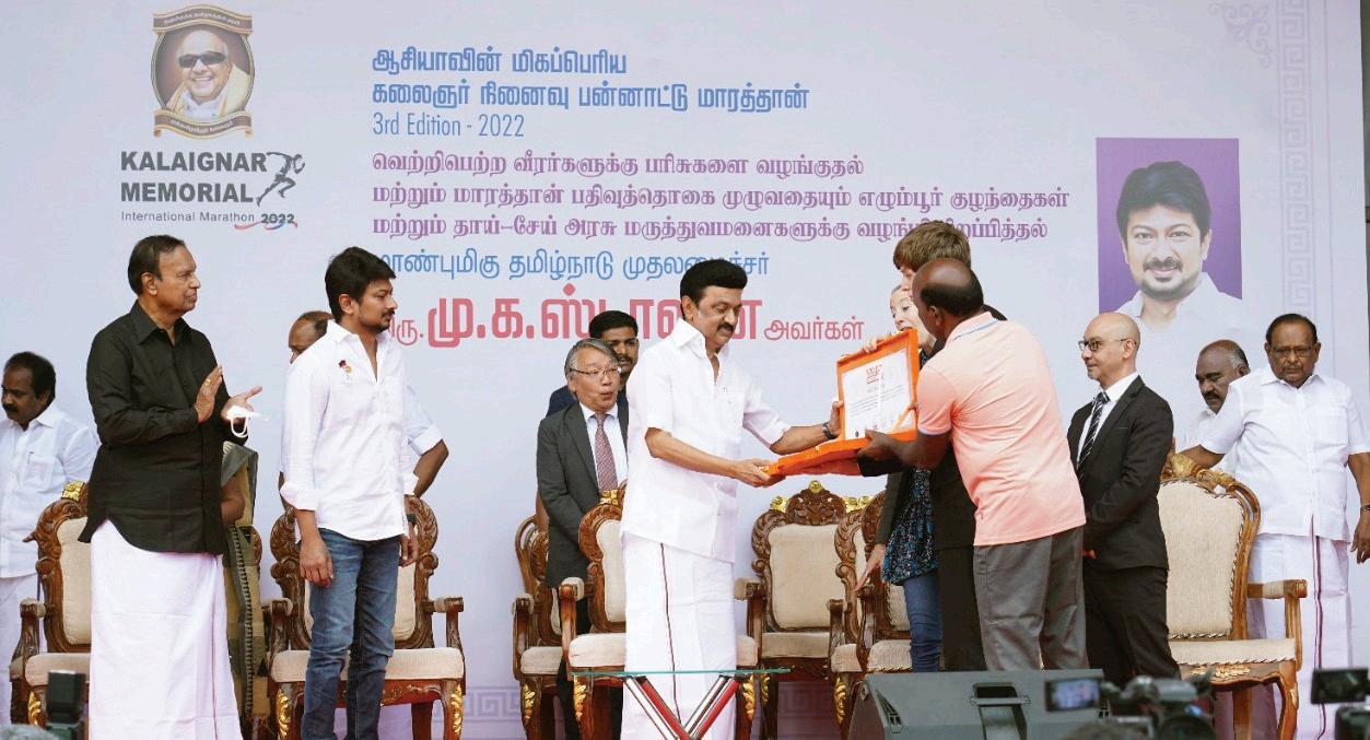 न्वशाल काय्डक्रम का आयोजन तपमलनार के स्वास्य ए्व परर्वार कलयाण मंत्री एम सुब्रमणयन द्ारा नकया गया था। हर साल आयोभजत होने ्वाले कलैगनार मैमोररयल इंटरनेशनल मैराथन को चार श्रेभणयों में बांटा गया था। मैराथन का उद्शय शारीररक नफटनेस और लोगों की िलाई के बारे में जागरूकता पैदा करना था। चेपॉक क्त्र के न्विायक उियननपि सटासलन ने पांच नकलोमीटर की मैराथन को झंरी ददखाकर र्वाना नकया और नगरपासलका प्रशासन, शहरी ्व जल आपूरत मंत्री के एन नेहरू ने 10