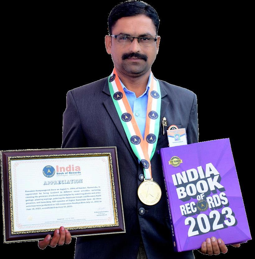 Ramanna Hamparagundi (born on August 4, 1984) of Raichur, Karnataka, is appreciated for being involved in different social activities including cleaning the premises of schools and temples by removing plastic and other garbage, planting saplings, painting the Basavana temple and Basawan Katti premises; and launching 500 episodes of Digital Karnataka Quiz. All these activities were performed on 102 consecutive Sundays from July 11, 2021 to June 18, 2023, as confirmed on June 23, 2023.