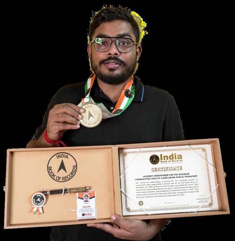 The record for undertaking a journey for the maximum number of consecutive days using public transport was set by Ark Ghosh (born on November 26, 1996) of Howrah, West Bengal, along with his friend. They started their journey from Howrah on July 31, 2023, visited 28 Indian states and 6 union territories, and completed it at Howrah on July 31, 2024. They undertook the journey for 366 consecutive days, using public transport like bus, train and ferries, as confirmed on September 28, 2024.