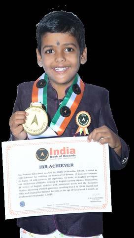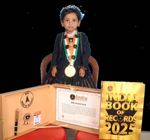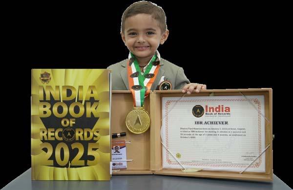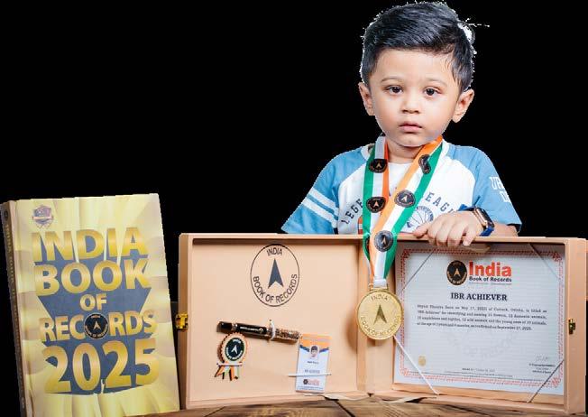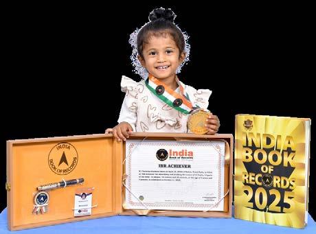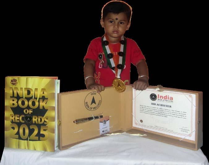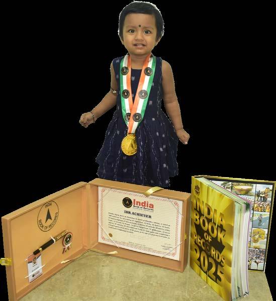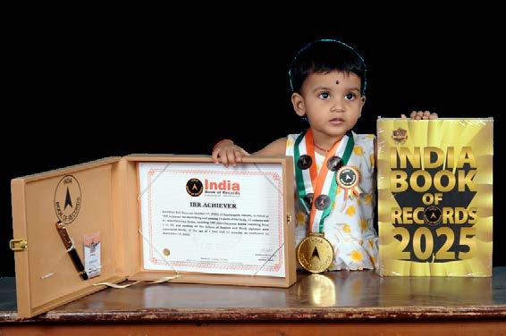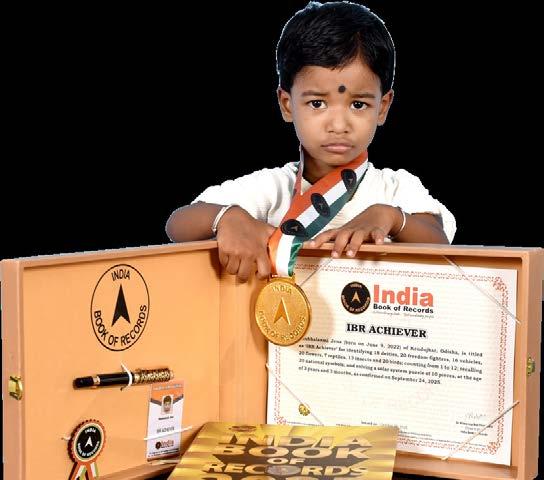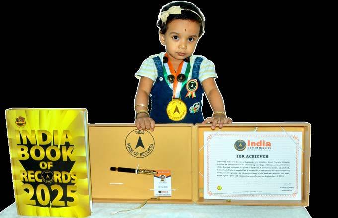 Samruddhi Priyadarshini Patra (born on April 10, 2022) of Subarnapur, Odisha, is titled as ‘IBR Achiever’ for identifying and naming 15 vegetables, 15 fruits, 9 shapes, 9 birds, 11 vehicles and 10 parts of the body; reciting 10 English nursery rhymes, letters of the English and Hindi alphabet, 10 mantras, 6 seasons, days of the week and months in a year; answering 8 G.K. questions; recalling 12 national symbols, capitals of all 28 states of India; and counting from 1 to 100, at the age of 3 years and 5 months, as confirmed on October 1, 2025.