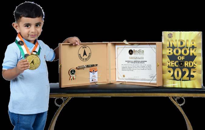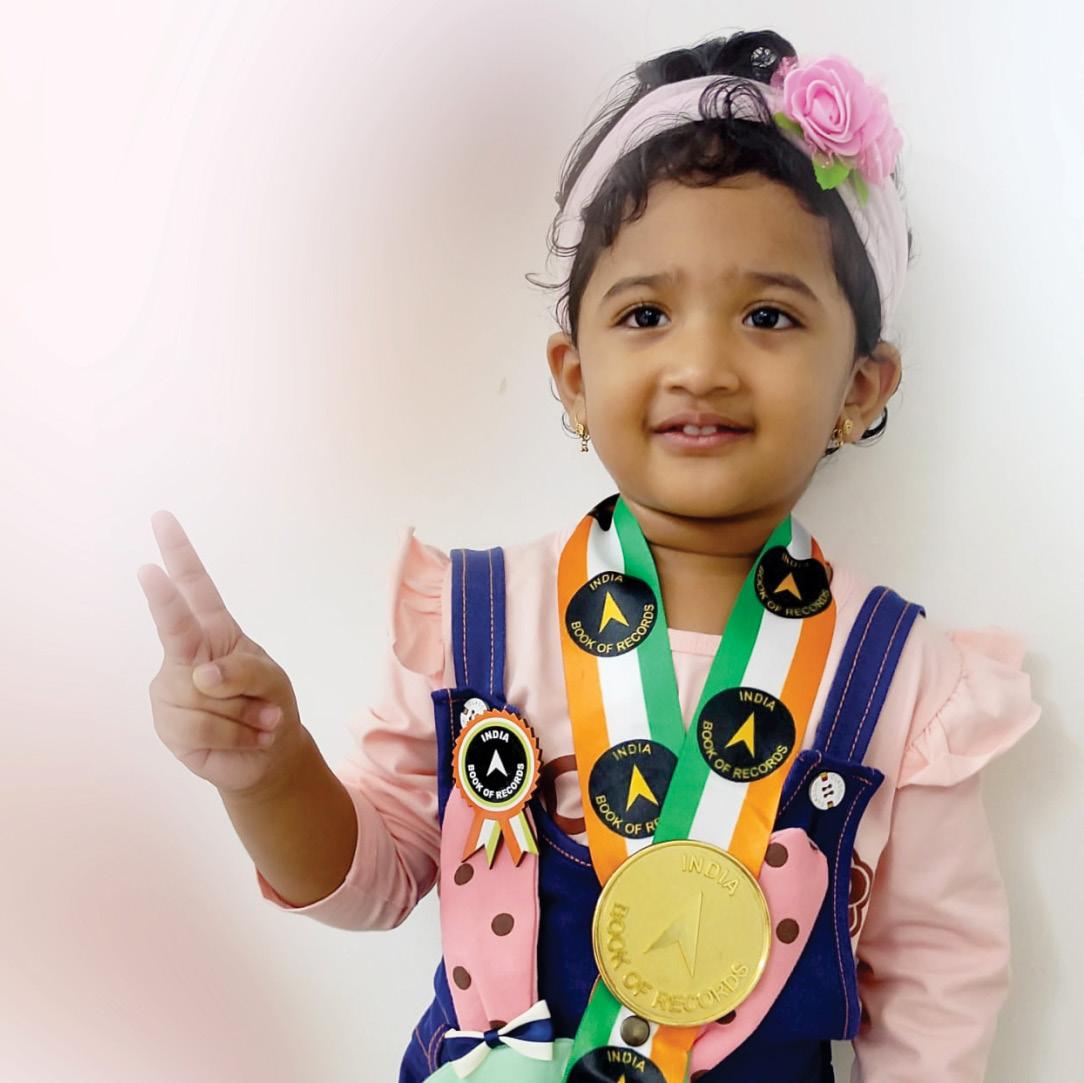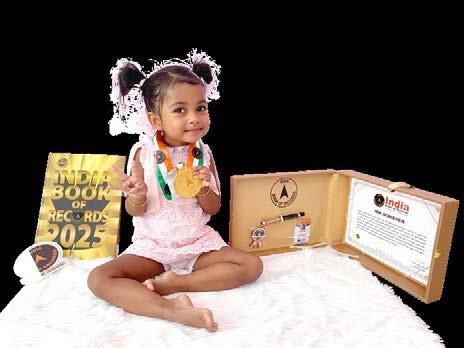 Manasvi Praveen (born on January 10, 2023) of Tumakuru, Karnataka, is titled as ‘IBR Achiever’ for identifying and naming 8 fruits, 26 animals, 15 parts of the body, 26 alphabetical words; reciting days of the week, months in a year, 5 English nursery rhymes, 10 shlokas, 5 national symbols and all the letters of the English and Kannada alphabet; counting from 1 to 20; sorting and stacking 25 geometric shapes, at the age of 2 years and 9 months, as confirmed on October 2025.