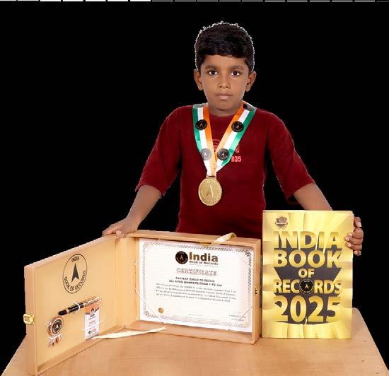 A. S. Vinav Aadithya (born on May 20, 2023) of Coimbatore, Tamil Nadu, is titled as ‘IBR Achiever’ for identifying 22 household items, 15 vehicles, 14 fruits, 12 wild animals, 11 professions, 11 actions, 10 domestic animals, 10 cartoon characters and 10 colours; reciting letters of English and Tamil alphabet, 2 English nursery rhymes, days of the week and months in a year; and counting from 1 to 10, at the age of 2 years and 4 months, as confirmed on September 27, 2025.