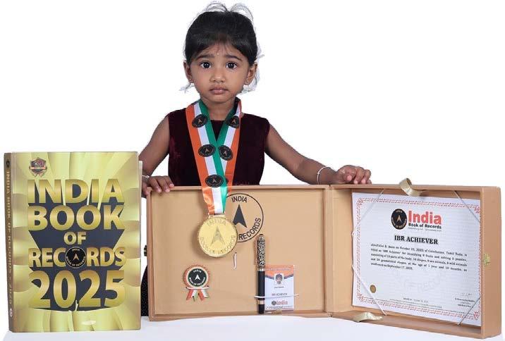 M. Christina Eucharis (born on April 14, 2022) of Salem, Tamil Nadu, is titled as ‘IBR Achiever’ for identifying and recalling the names of 14 fruits, 13 parts of the body, 12 shapes, 10 colours and 10 animals, at the age of 3 years and 5 months, as confirmed on October 2025.