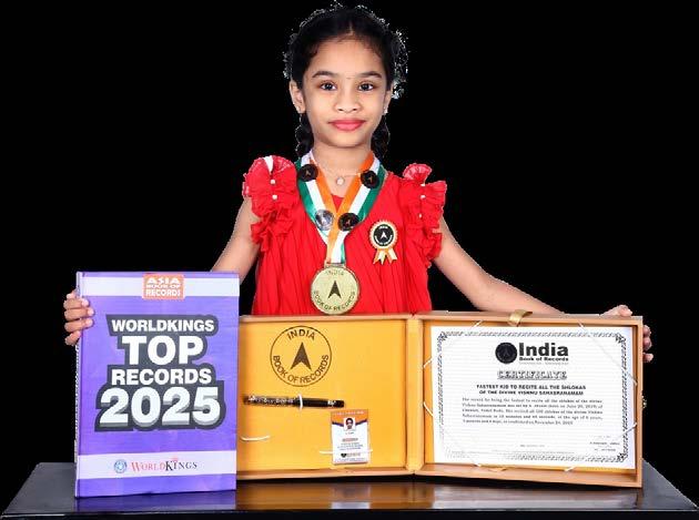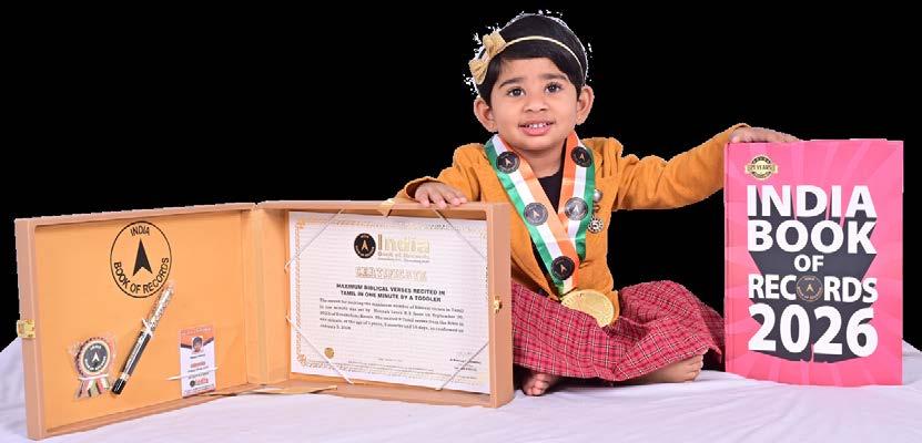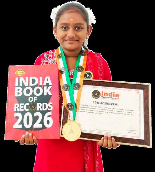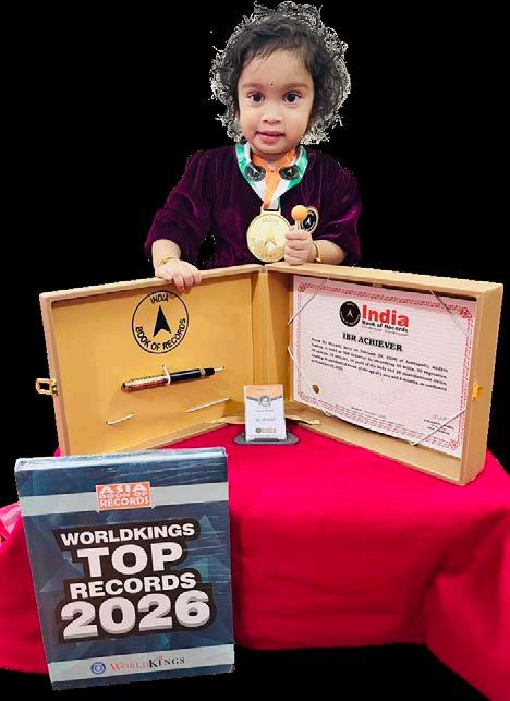 Sahasra Hariprasath (born on November 6, 2022) of Puducherry, is titled as ‘IBR Achiever’ for identifying 25 parts of the body, 21 vegetables and 8 shapes; recalling 20 English antonyms and the initial letters of 20 animals; reciting months in a year, days of the week and 2 nursery rhymes; singing 2 Tamil devotional songs; and counting from 1 to 50, at the age of 3 years and 1 month, as confirmed on December 9, 2025.